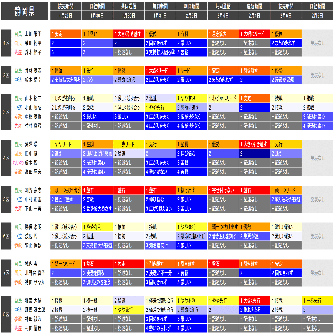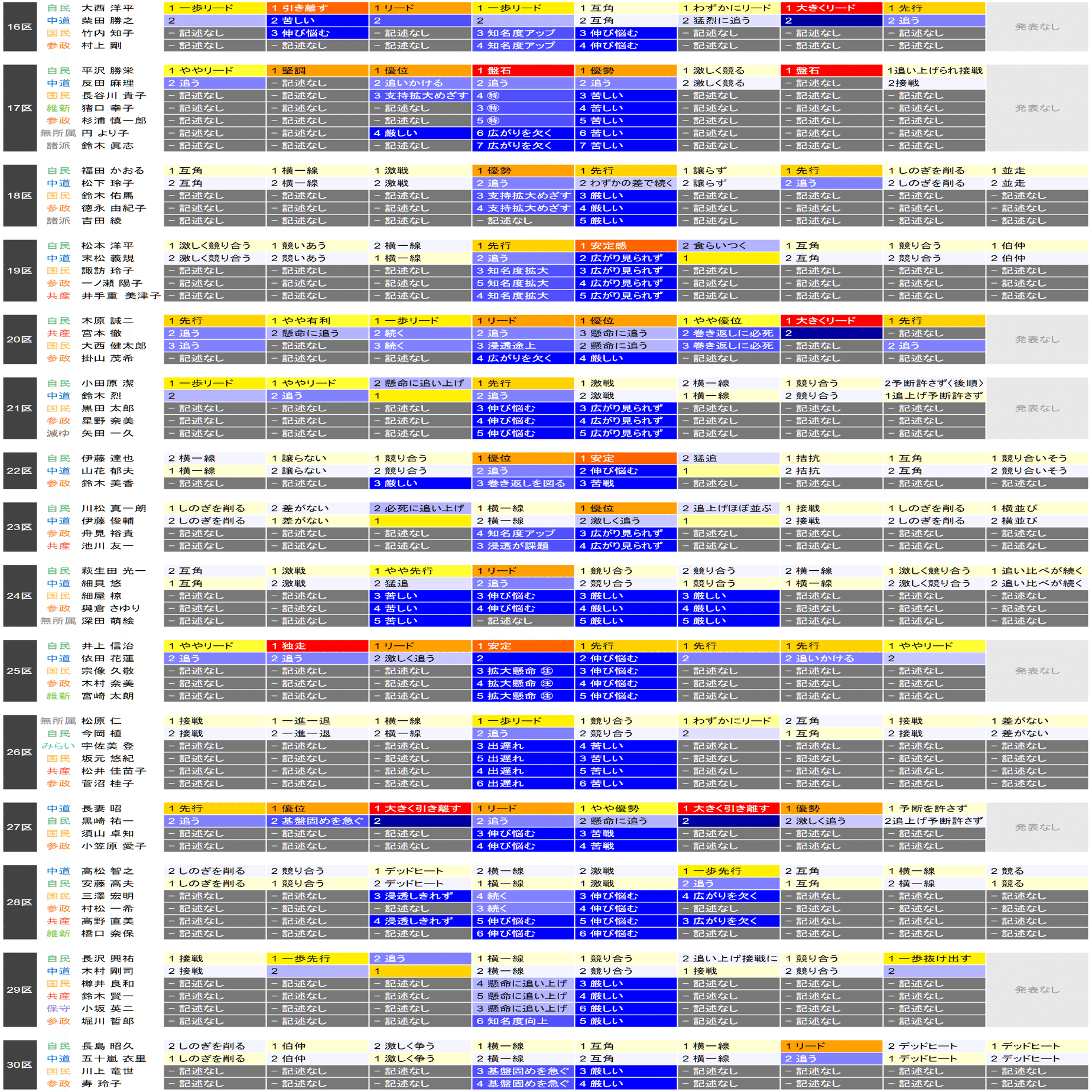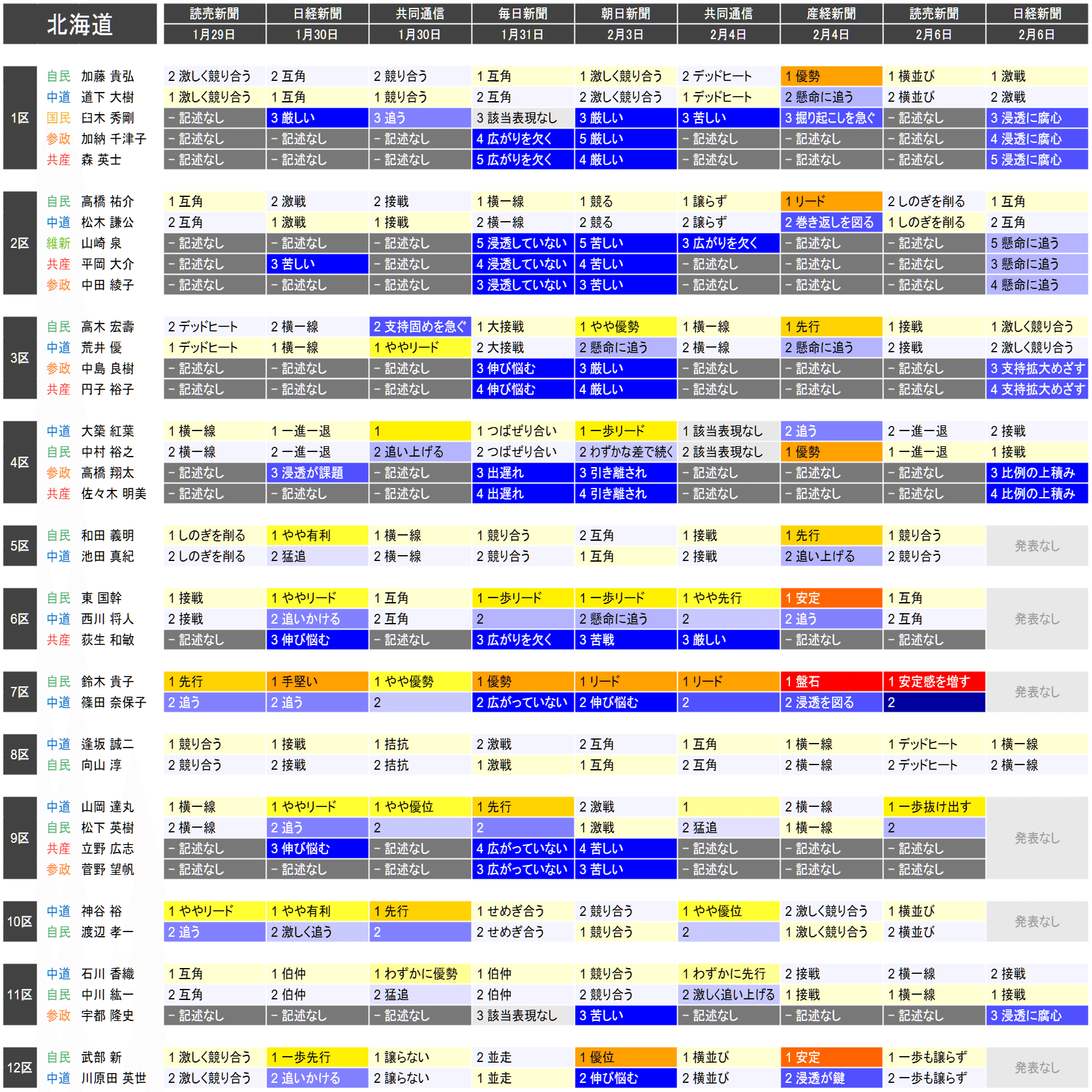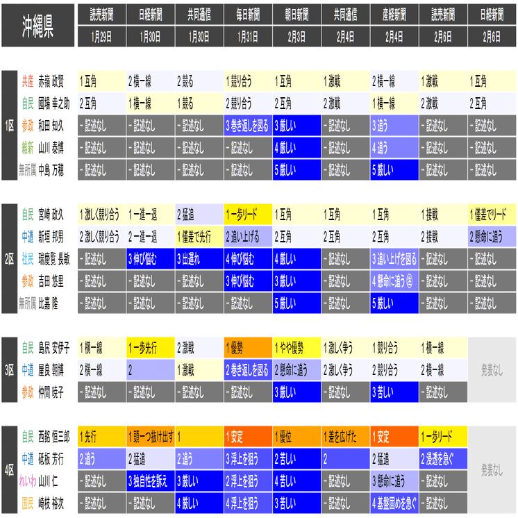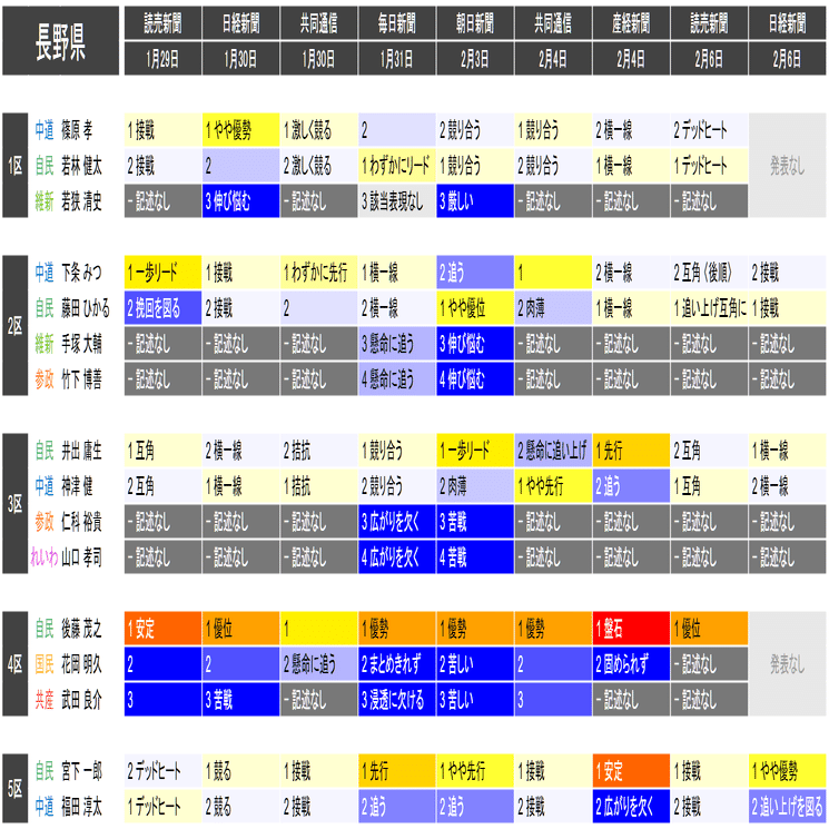 ●それぞれの小選挙区の候補者は、上の表における「階級」の平均値が大きい者から順に並べられています。すなわち、各社の報道が総じて優勢とみなしている候補を上から順に配置するようにしています。平均値が同じ場合は、最も左の(古い)情勢報道を除外して平均を再計算することを、差がつくまで行って配置します。
