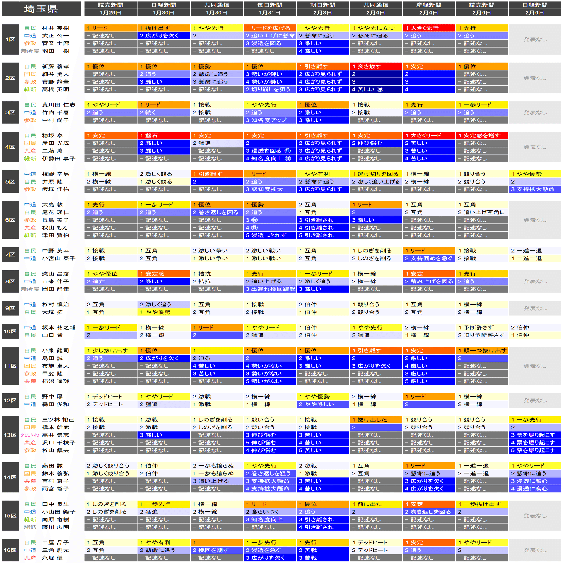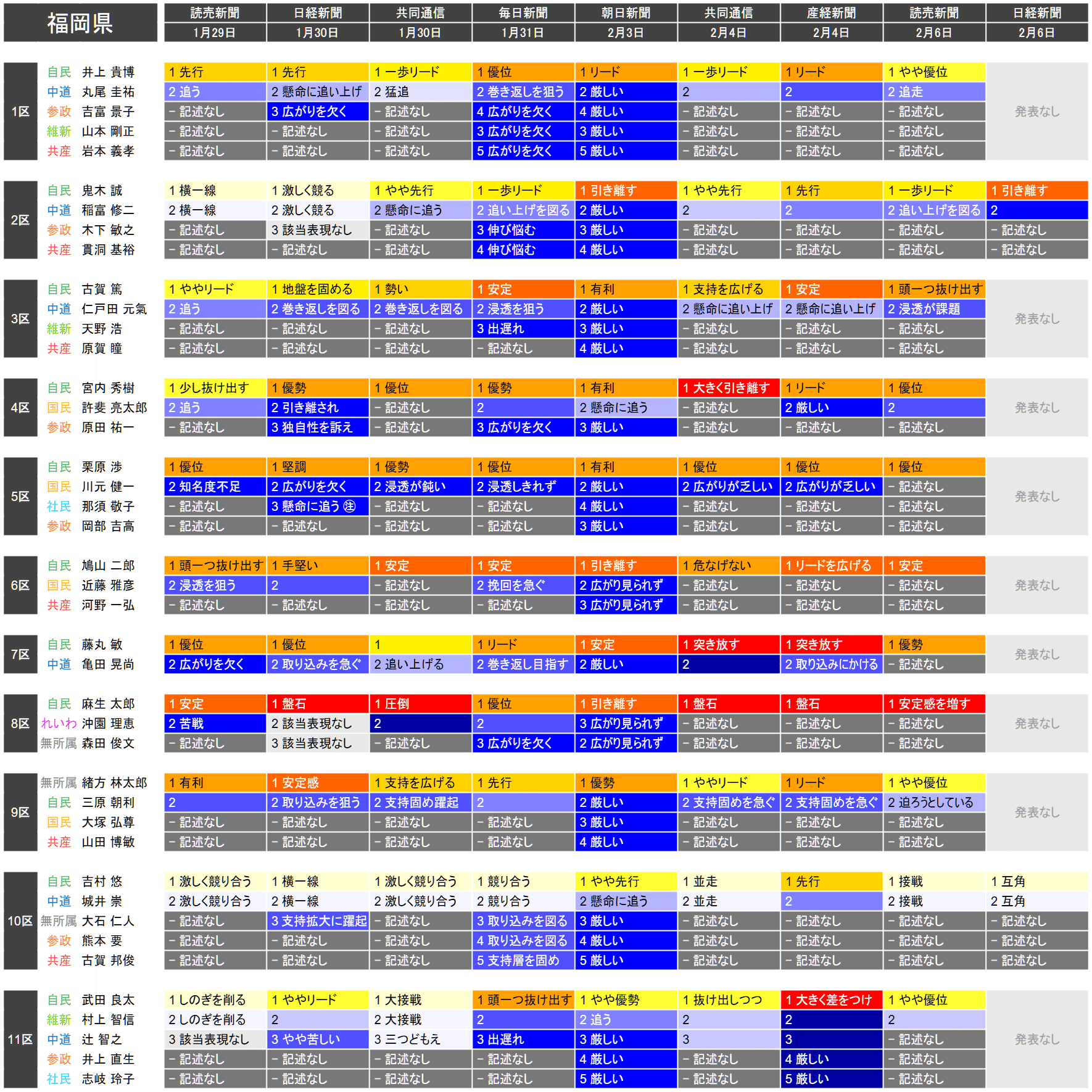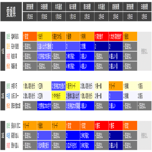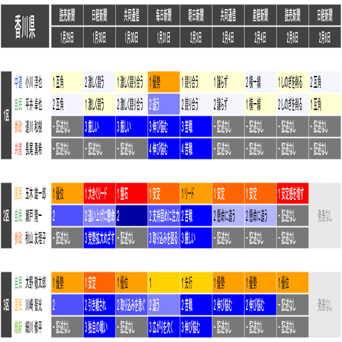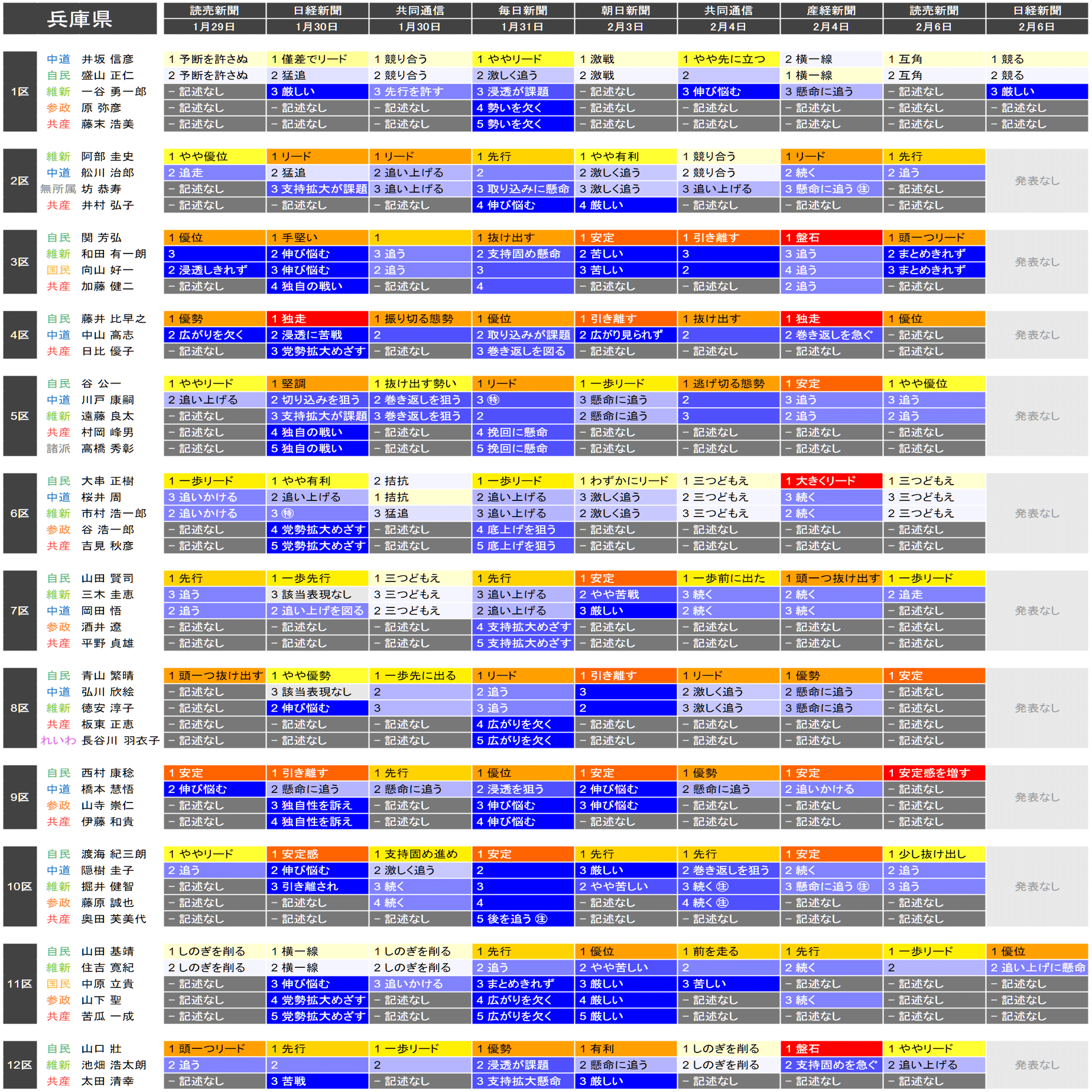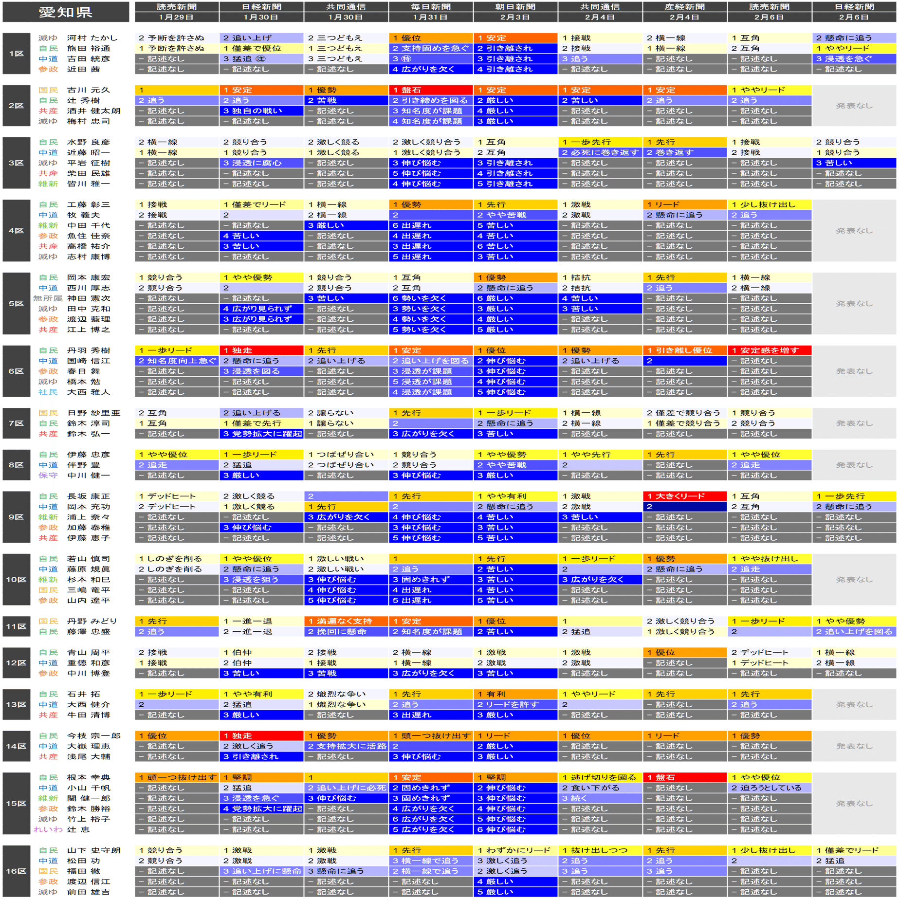 ●それぞれの小選挙区の候補者は、上の表における「階級」の平均値が大きい者から順に並べられています。すなわち、各社の報道が総じて優勢とみなしている候補を上から順に配置するようにしています。平均値が同じ場合は、最も左の(古い)情勢報道を除外して平均を再計算することを、差がつくまで行って配置します。