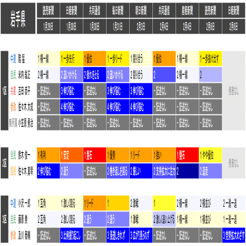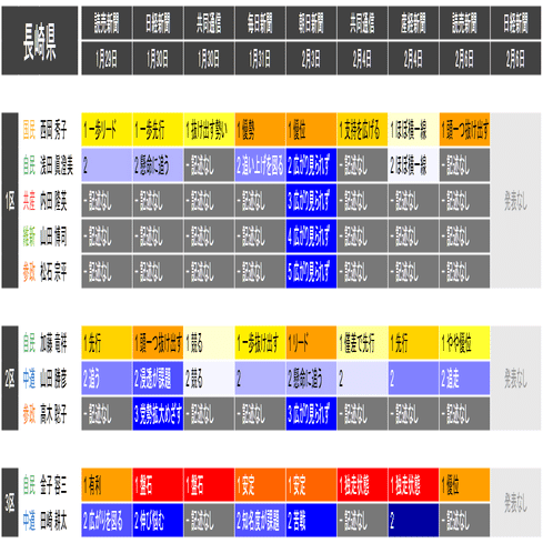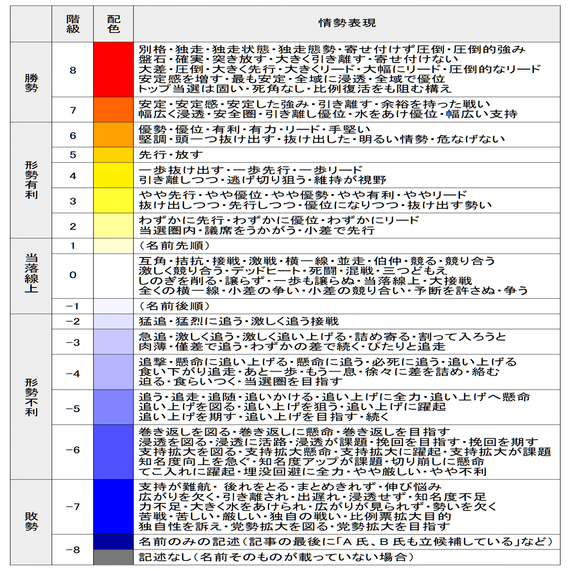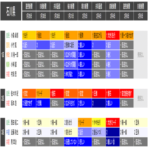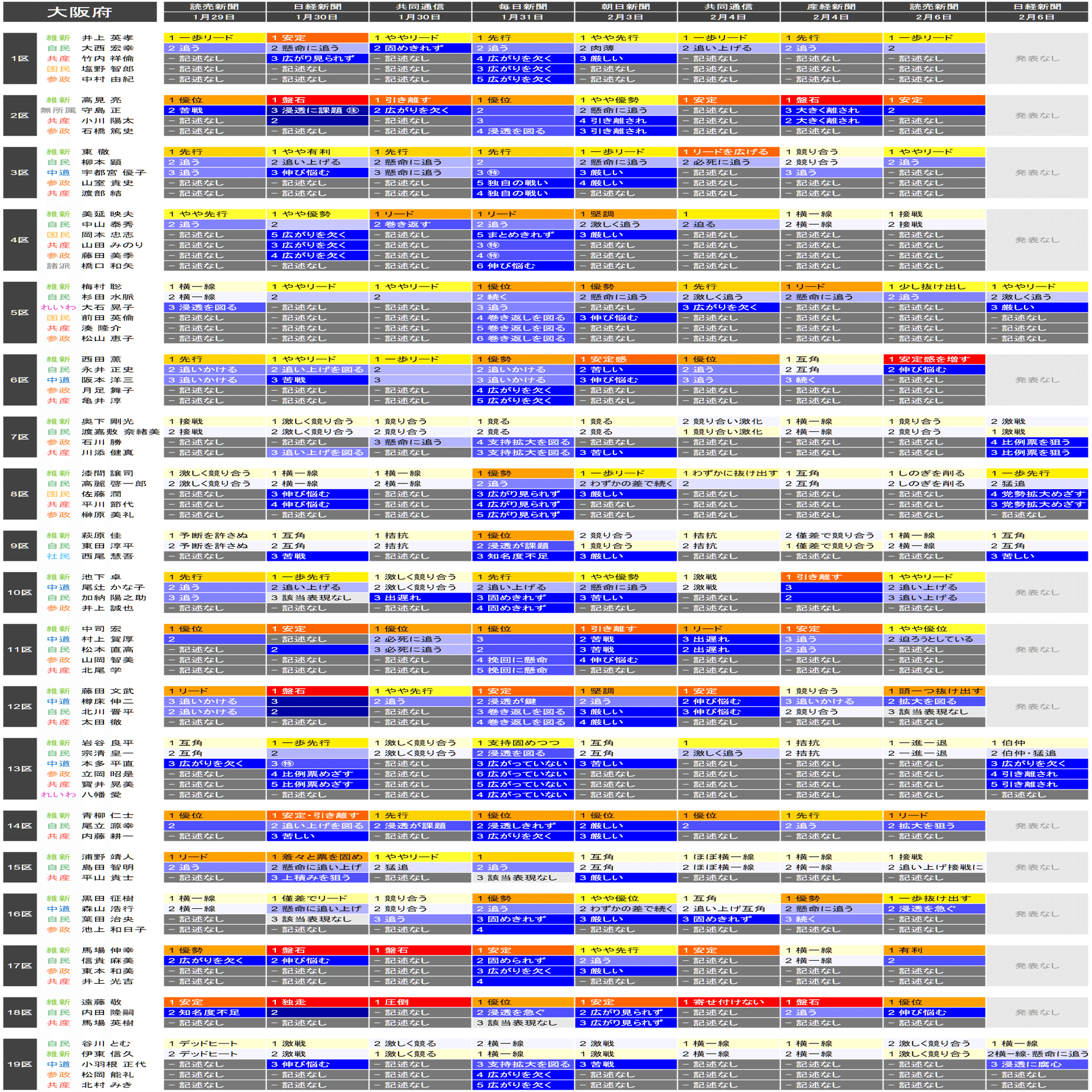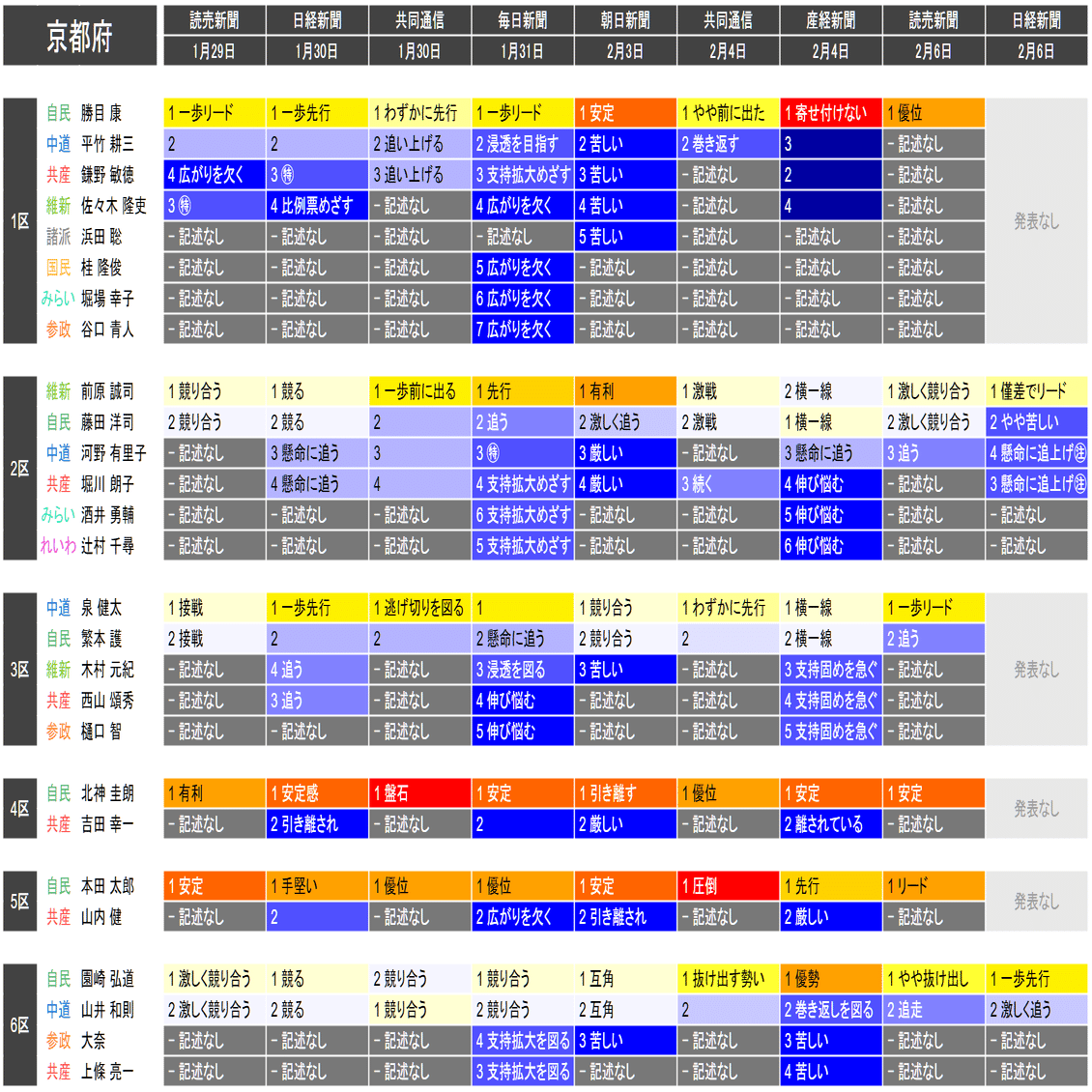 ●それぞれの小選挙区の候補者は、上の表における「階級」の平均値が大きい者から順に並べられています。すなわち、各社の報道が総じて優勢とみなしている候補を上から順に配置するようにしています。平均値が同じ場合は、最も左の(古い)情勢報道を除外して平均を再計算することを、差がつくまで行って配置します。