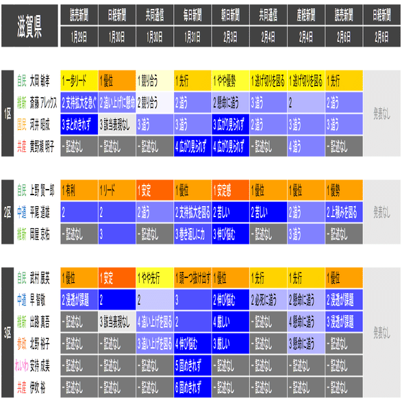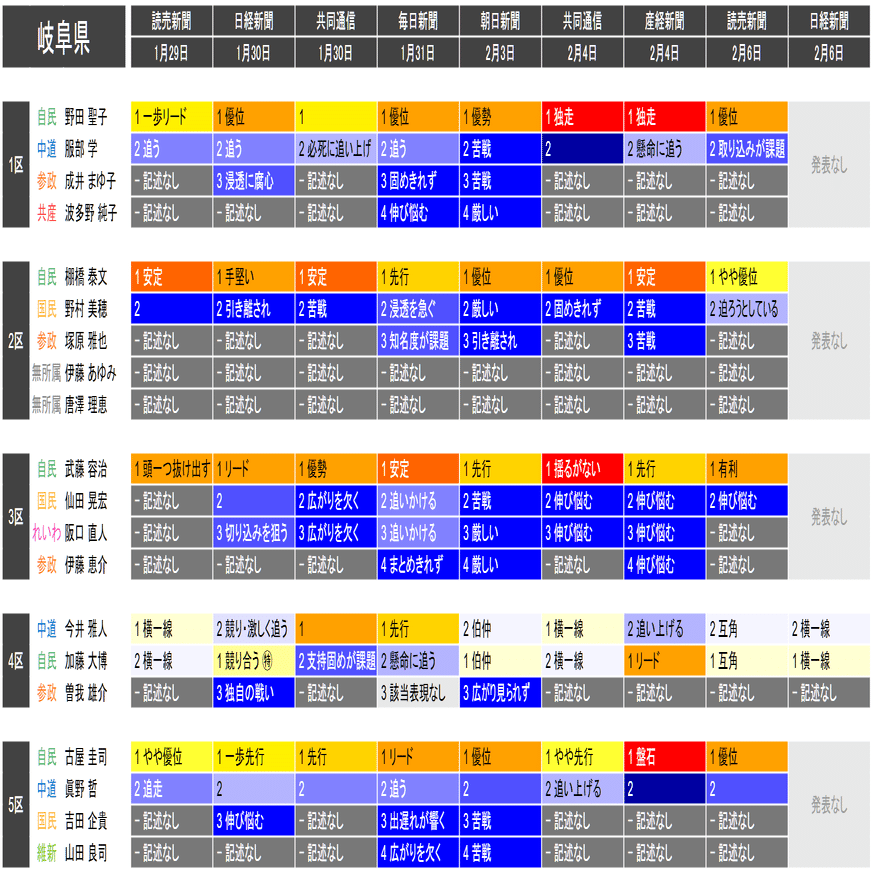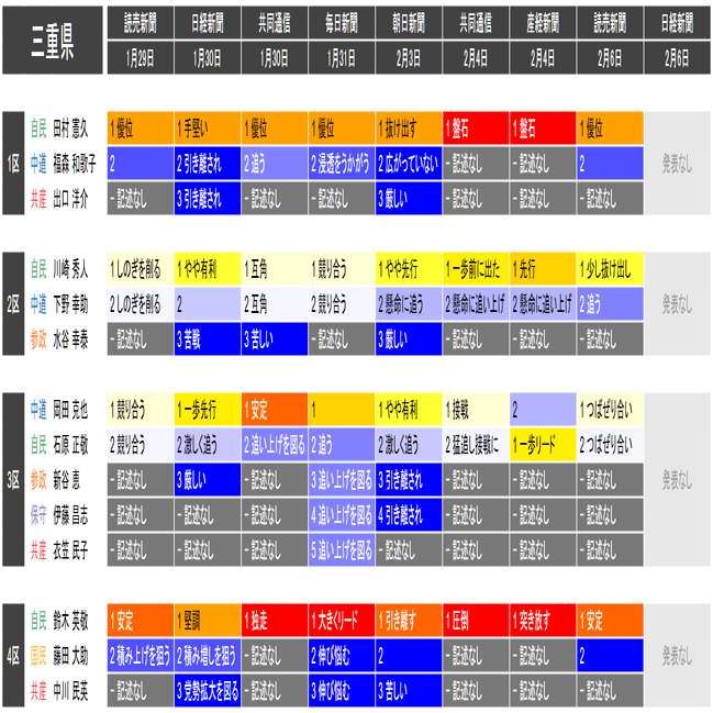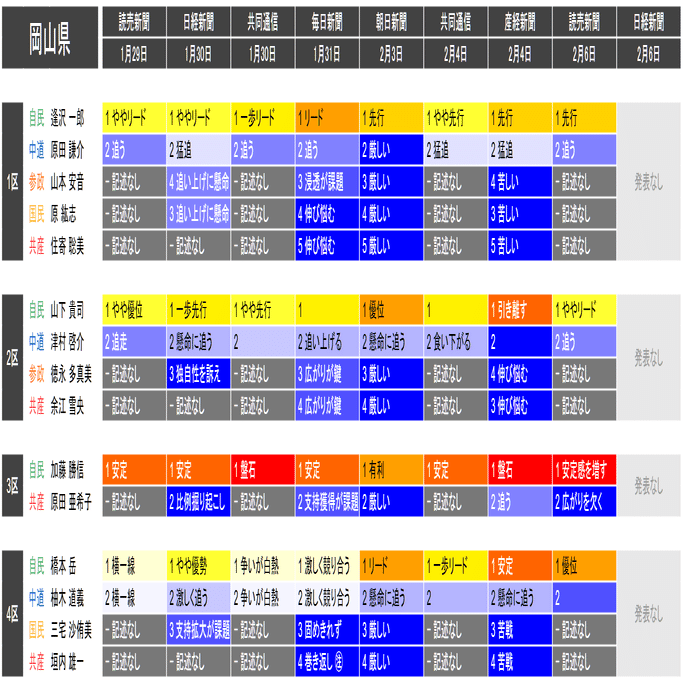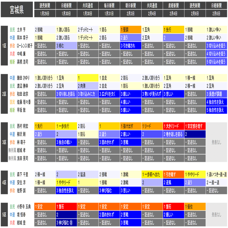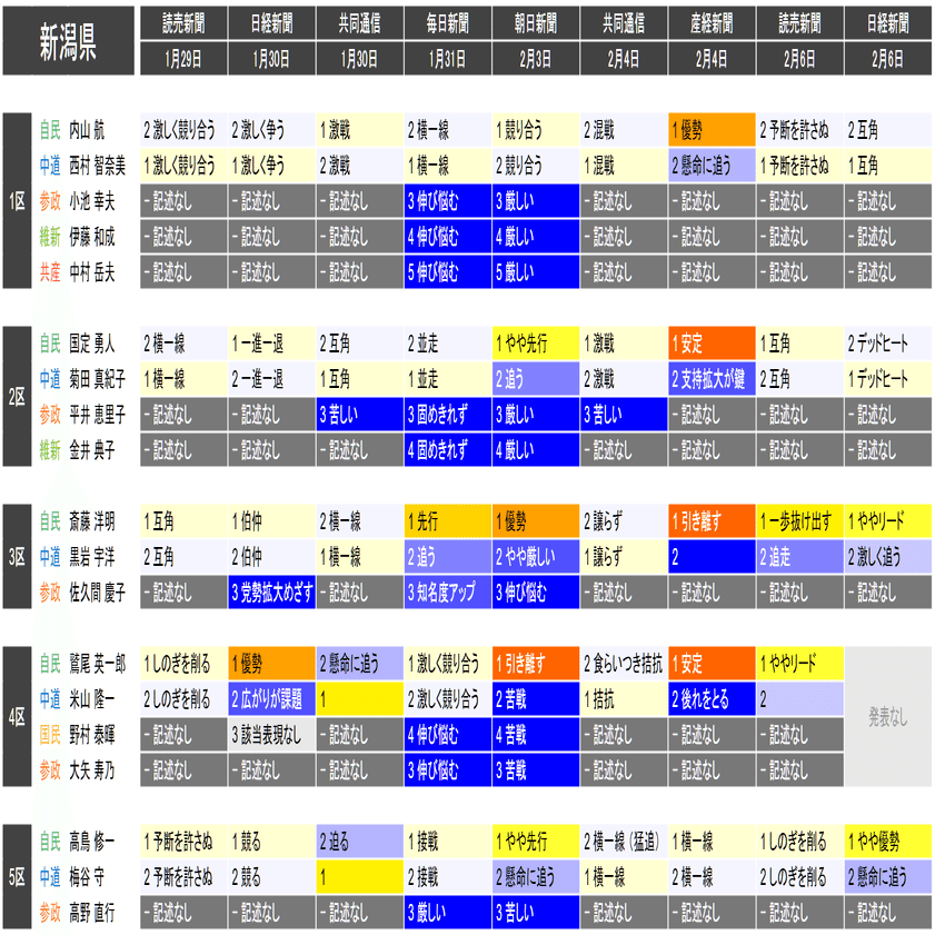 ●この情勢報道集約は当落の予測を意図したものではなく、各社の情勢報道の整合性や食い違いの確認と、事後的な選挙結果との検証を目的としたものです。あくまで細部を切り落とした要約であることに留意してください。また、すべての情勢報道を網羅しているわけではありません。新聞はあくまで紙面上で、全国の詳報が記述形式で掲載されたものに限って反映しています。欠落している情報は個別にご確認ください(なお2月6日の毎日新聞3面に一部の小選挙区への言及があります)。