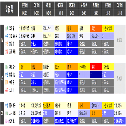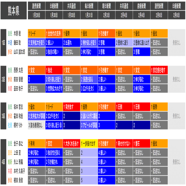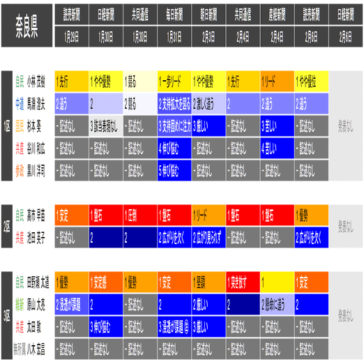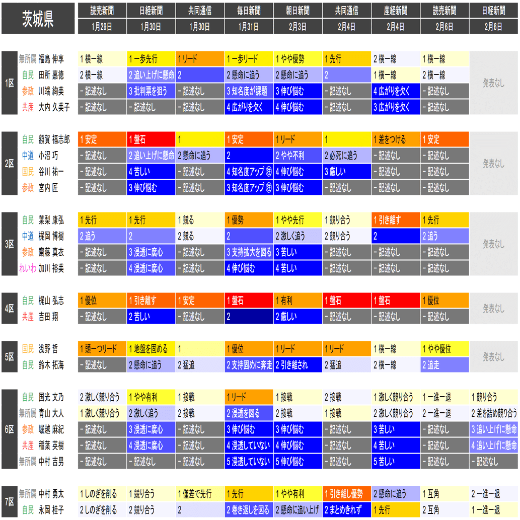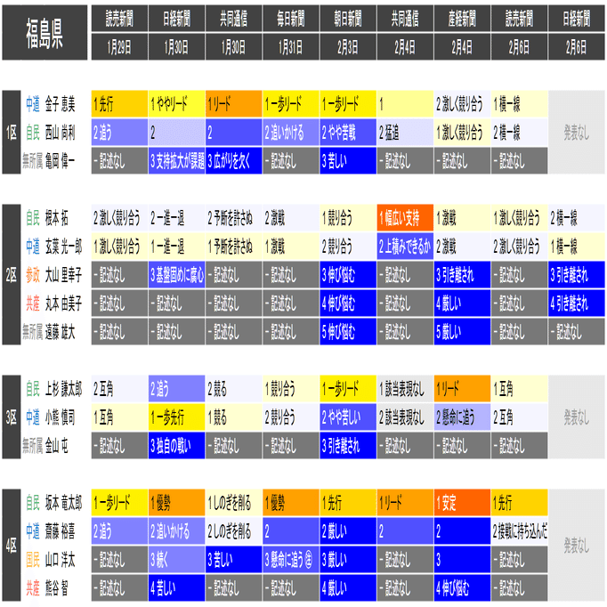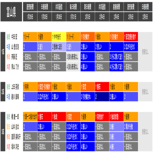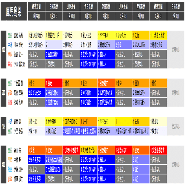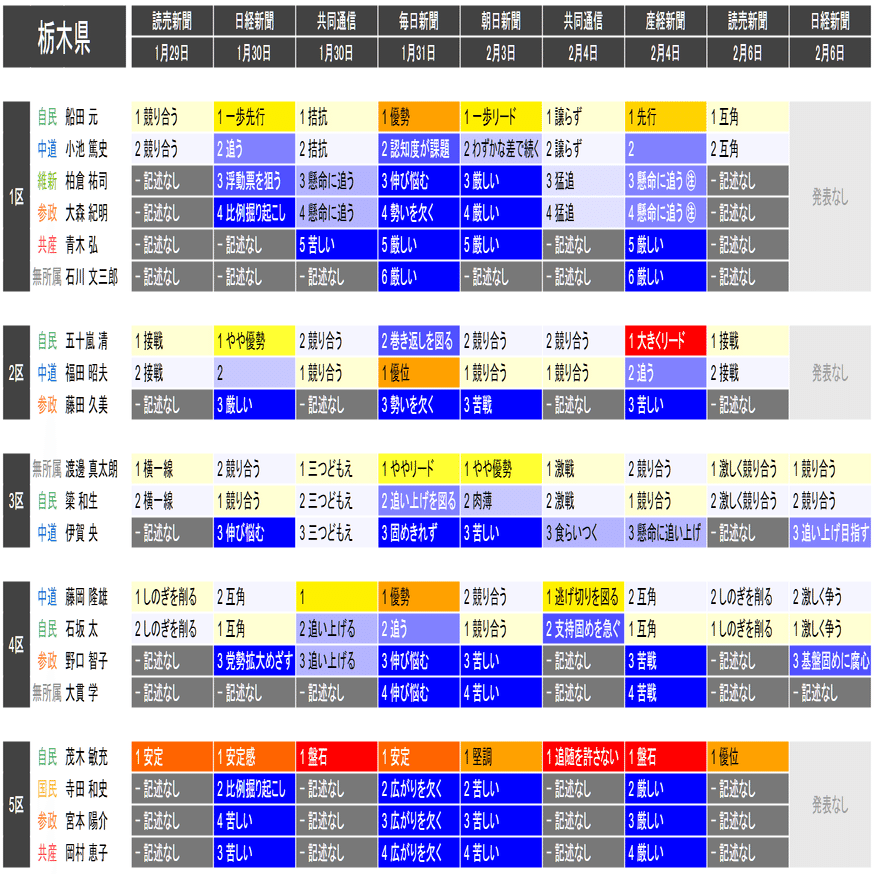 ●この情勢報道集約は当落の予測を意図したものではなく、各社の情勢報道の整合性や食い違いの確認と、事後的な選挙結果との検証を目的としたものです。あくまで細部を切り落とした要約であることに留意してください。また、すべての情勢報道を網羅しているわけではありません。新聞はあくまで紙面上で、全国の詳報が記述形式で掲載されたものに限って反映しています。欠落している情報は個別にご確認ください(なお2月6日の毎日新聞3面に一部の小選挙区への言及があります)。