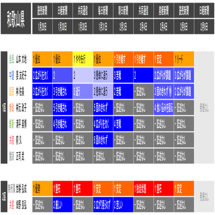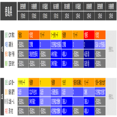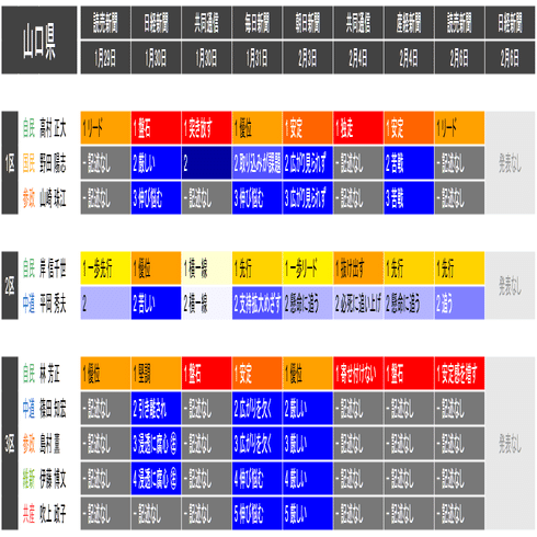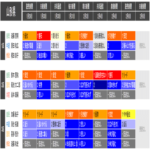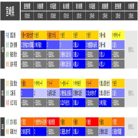 ●情勢表現の前に記載した数字(「1 リード」「2 懸命に追う」「3 厳しい」など)は、優劣が明記されている場合は優勢とされる順番で、明記されていない場合は記述された名前の順番です。