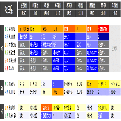 ●日付は右側の列ほど新しくなっていますが、情勢の評価や記述の仕方には各社で差があるため、必ずしも左から右にかけて情勢が変化していったとみなせるわけではありません。むしろ各社の報道が整合的なのか、食い違っているのかに注目してください。