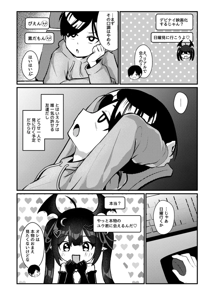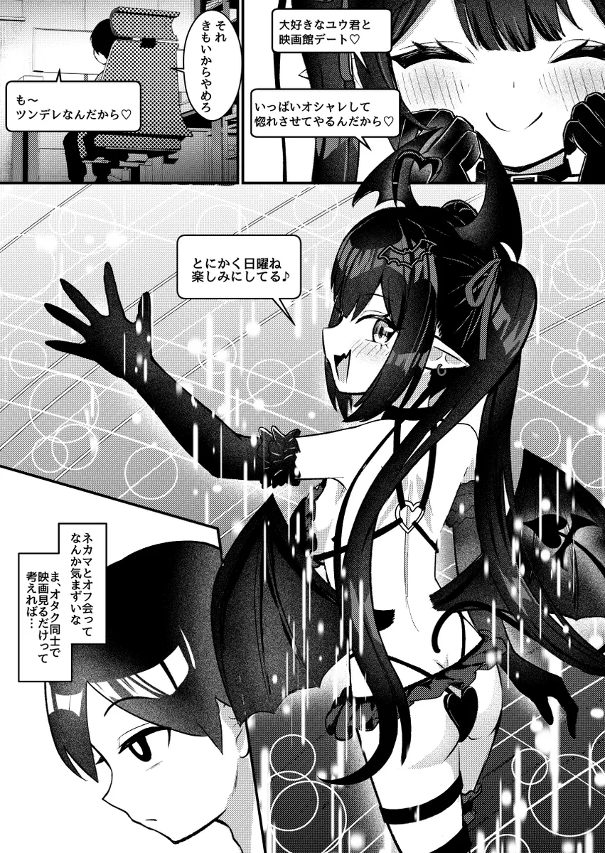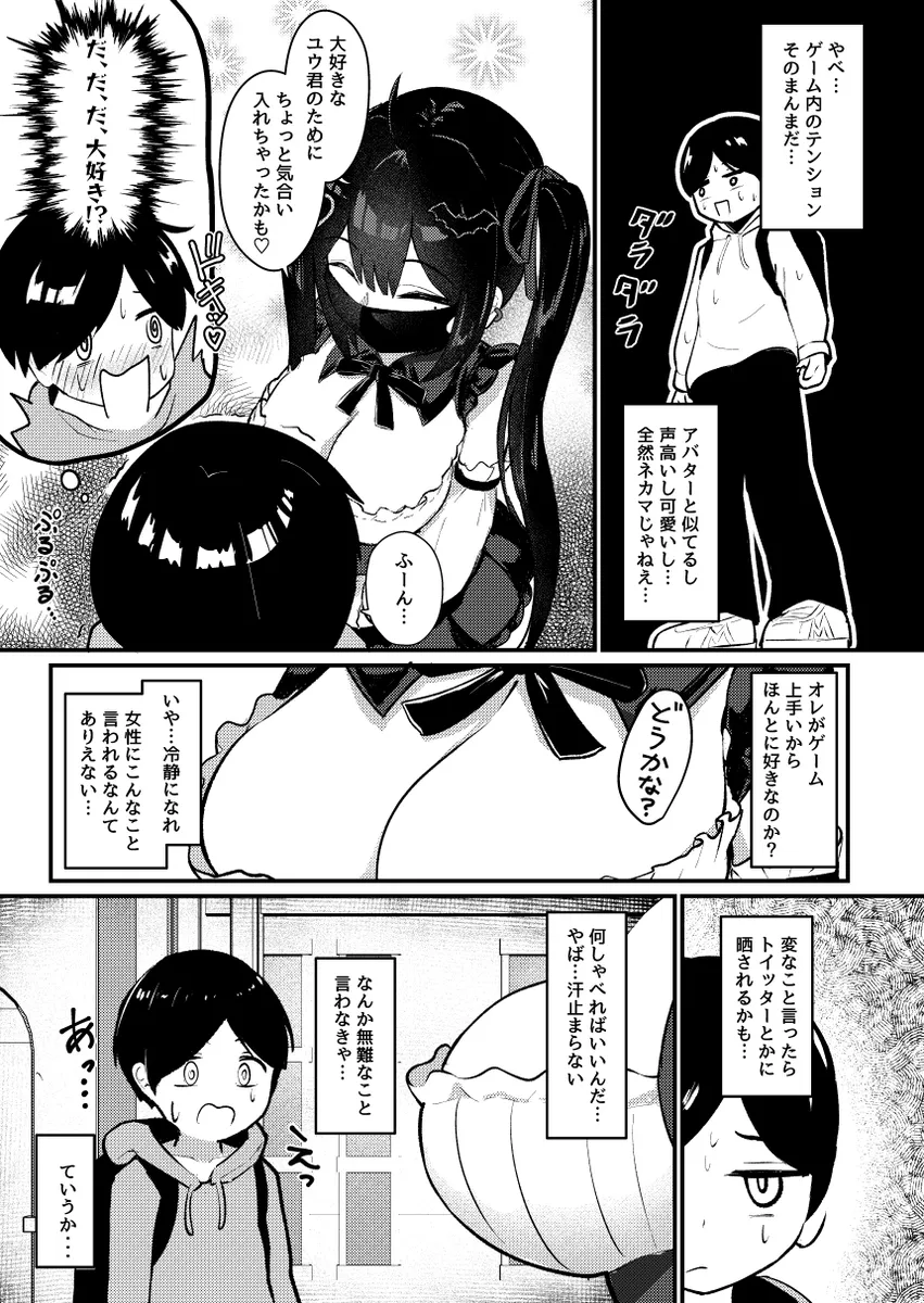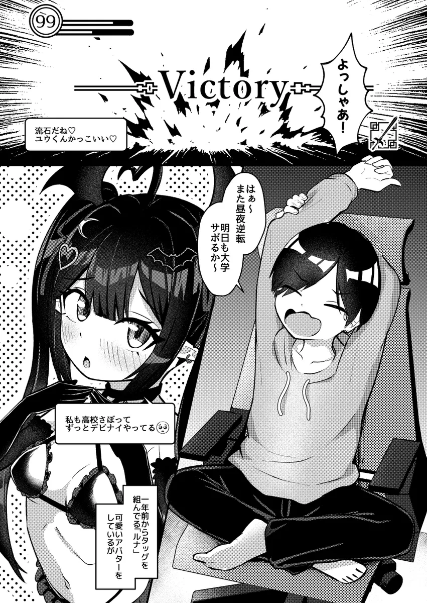ユウはデビルナイトメアというオンラインゲームで一年前からルナとタッグを組んでいた。ルナはどう見てもネカマだ。毎日朝までログインしているし、敵の攻撃パターンを全て把握していて隙が無い。ルナはJKを自称しているがユウは信じなかった。その日、ユウはルナと初めてのオフ会をすることに。そして、ユウの目の前に現れたのはツインテの爆乳娘だった。ルナは正真正銘の女性だったのだ。女耐性のないユウは手を握られただけでもチンポが勃起してしまう。それを見たルナはズボンの上からチンポをカリカリ。その流れでホテルに連れ込まれたユウはルナがサキュバスであることを知り…。