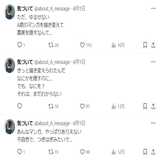 「気づいて」アカウントでもマンガの改ざんについて言及しており、原稿の改変箇所が『施設にとって都合の悪い部分=調査の手がかり』になるのではないか、という推測が成り立ちます。