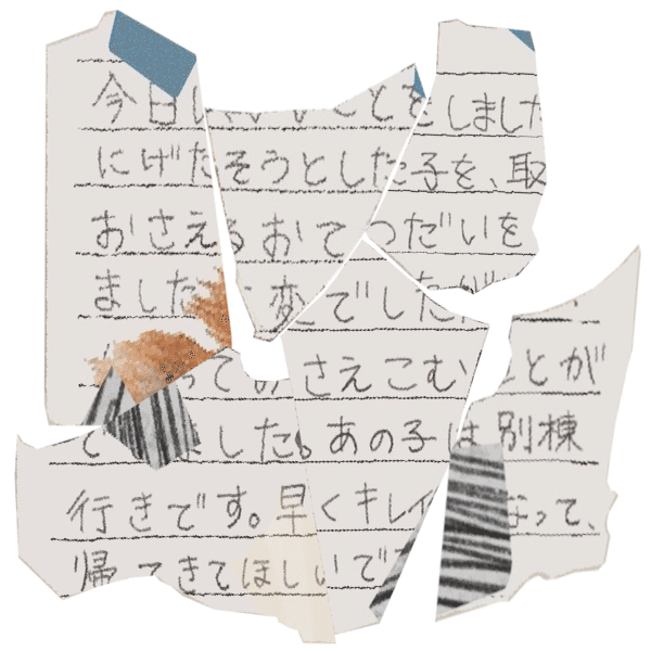 『今日はいいことをしました にげだそうとした子を、取りおさえるおてつだいをしました 大変でしたががんばっておさえこむことができました。 あの子は別棟行きです。早くキレイになって帰ってきてほしいです』