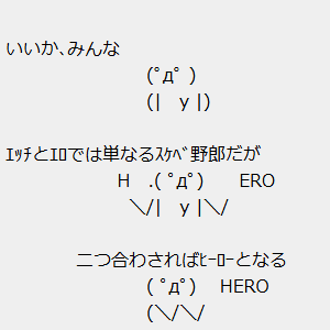 「H」と「ERO」を合わせると「HERO」(ヒーロー)になる。このネタは、2ちゃんねるの「いいか、みんな」というセリフから始まる「二つ合わせれば」系コピペで有名になった。コピペ自体は、2ちゃんねる『ガン=カタのガイドライン2』にてAA(アスキーアート)付きで使用された構文が元になっており、ここにふたばちゃんねるで書き込まれた「「悟り」は分解すると小五ロリになる」(2004年6月13日)が融合されたことを発端として次々と派生ネタが誕生していったとの事。「エッチ(H)とエロいね(EROINE)では単なるスケベ野郎だが二つ合わさればヒロイン(HEROINE)となる」のバージョンもある。