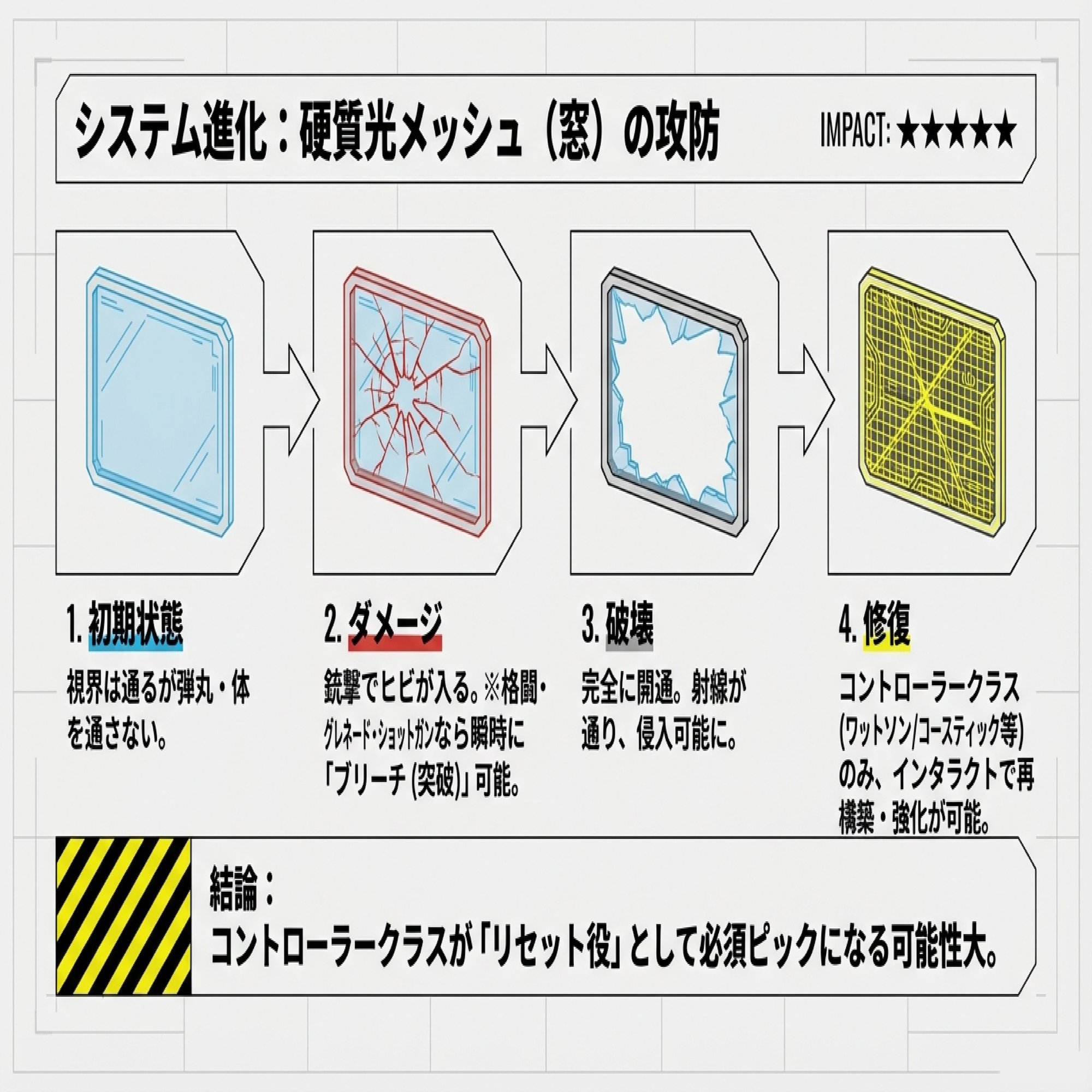 コントローラークラスが特権: ワットソンとかコースティックは、この壊れた窓を修復してさらに強化できちゃうの!これでまた鉄壁の要塞が作れちゃうから、籠り勢にはたまらないよね!