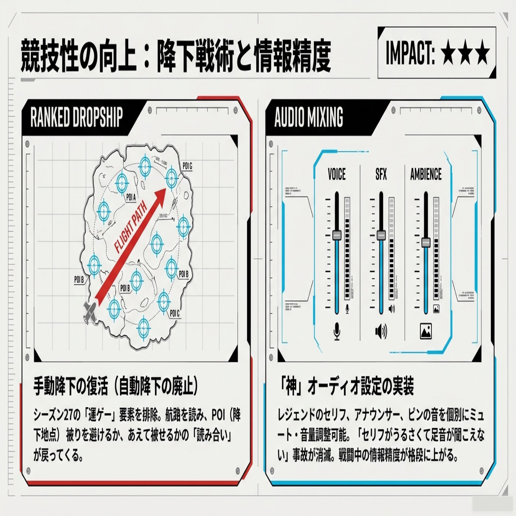 レジェンドのボイス、ピンの音、アナウンサーの声を個別に調整したりミュートできる機能が追加されるよ。