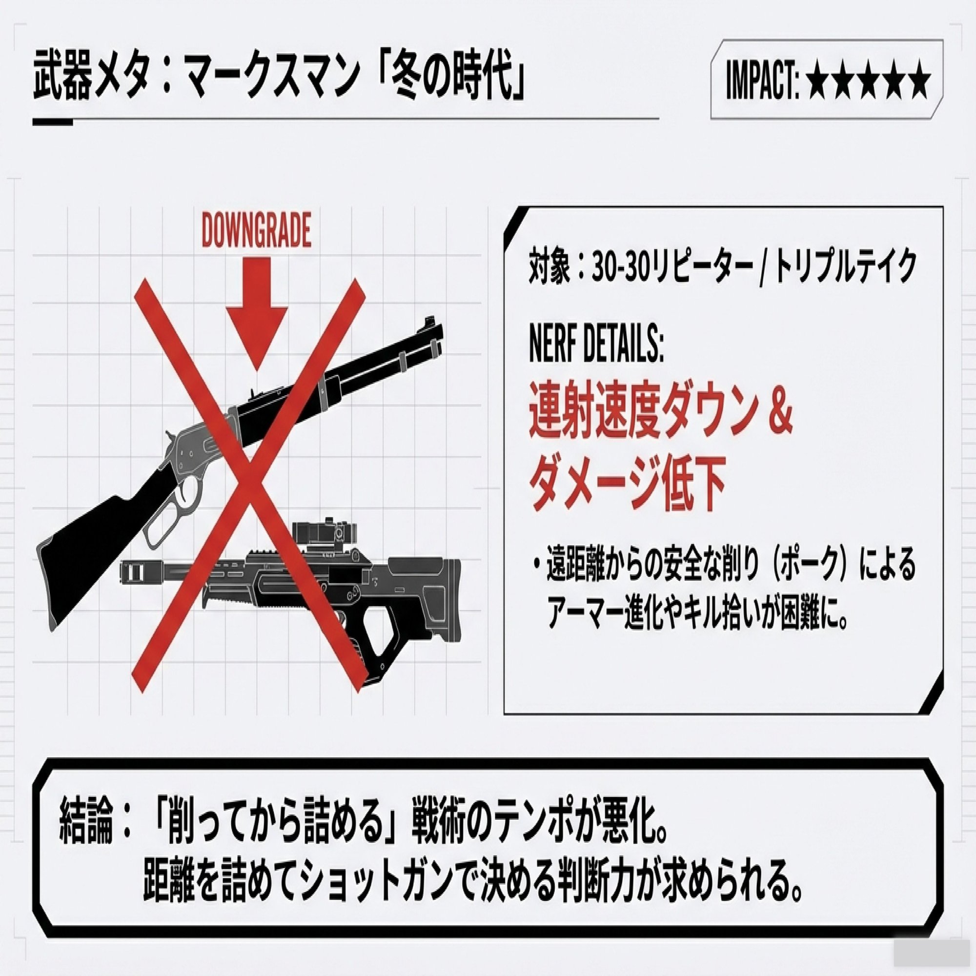 リピーターとかトリプルテイクは、連射速度もダメージも下げられちゃうみたい。今までみたいに遠くからペチペチ撃ってるだけじゃ勝てなくなるから、立ち回り変えないとだね!