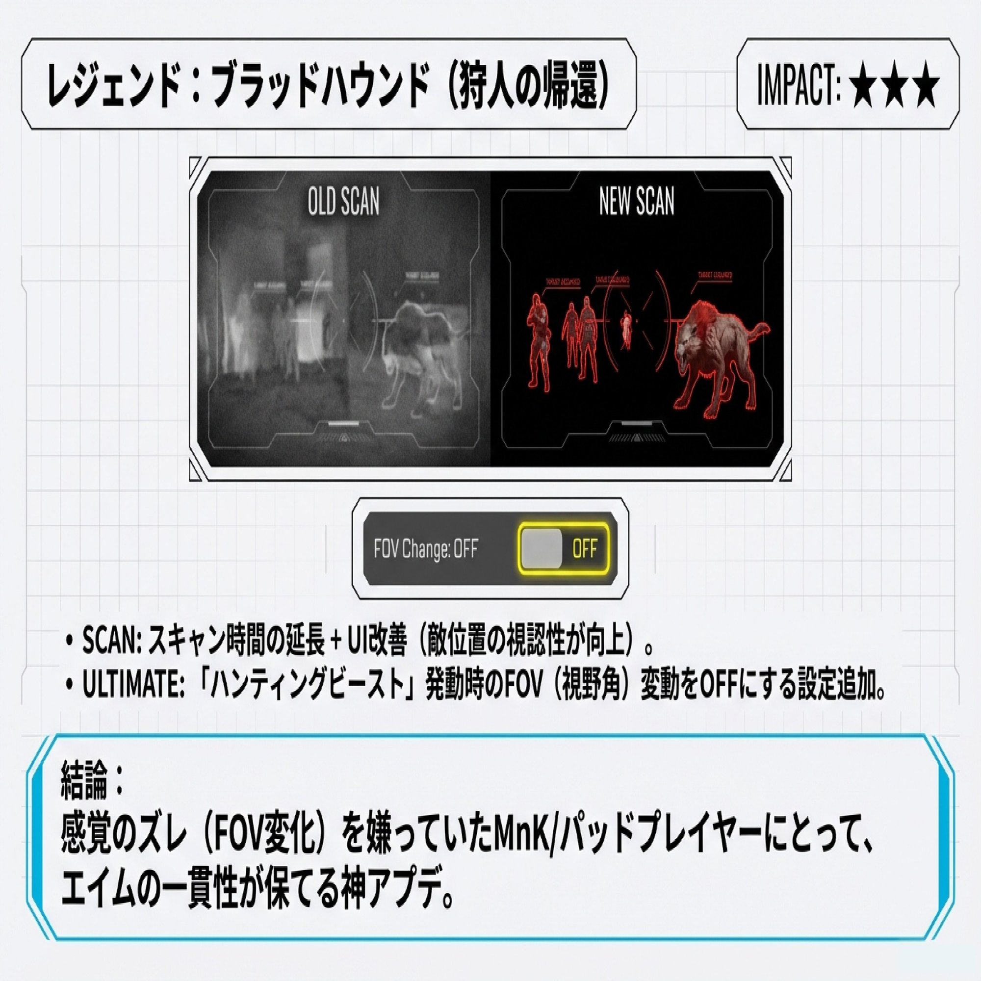 視野角設定: ウルト使った時の「画面がグワッってなる演出」をオフにできるようになるの!これでエイムが乱れにくくなるから、ブラハ使いには神アプデだね。