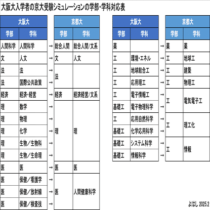 大阪大の入学者の京大受験シミュレーションを行うにあたり、近い専攻の学部・学科を受験するという前提を置くため、学部・学科の対応を整理する必要があります。細かい専門の差異はあるかもしれませんが、両大学のホームページも見ながら、こちらのような対応でシミュレーションを行うことにします。