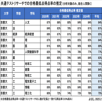 この考え方で、京大の学部学科ごとに定員=リサーチでの志望者累計となる得点率を集計すると、次のようになっています。これを合格最低点得点率と定義し、この得点率を超える受験生は京大に合格する学力があるとみなします。