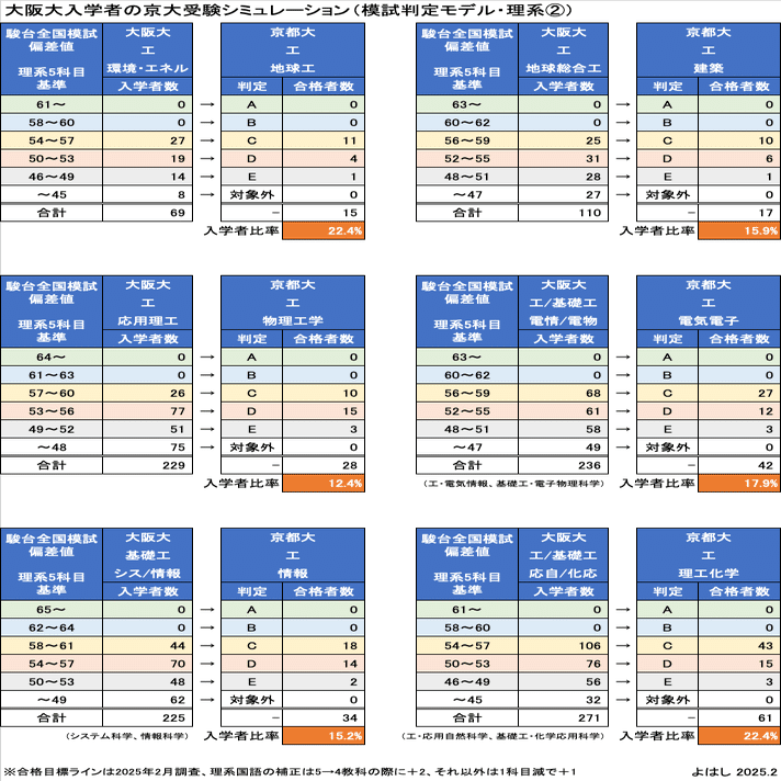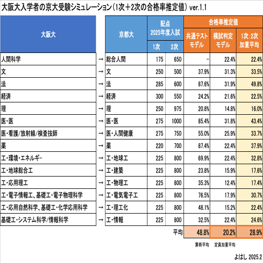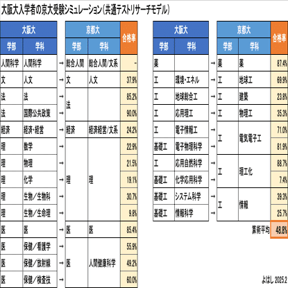 この2つを併記するなら、「もしも大阪大入学者が、京都大の専攻の近い学部学科を受験するなら、合格するのは2〜3割程度」という結論となります。