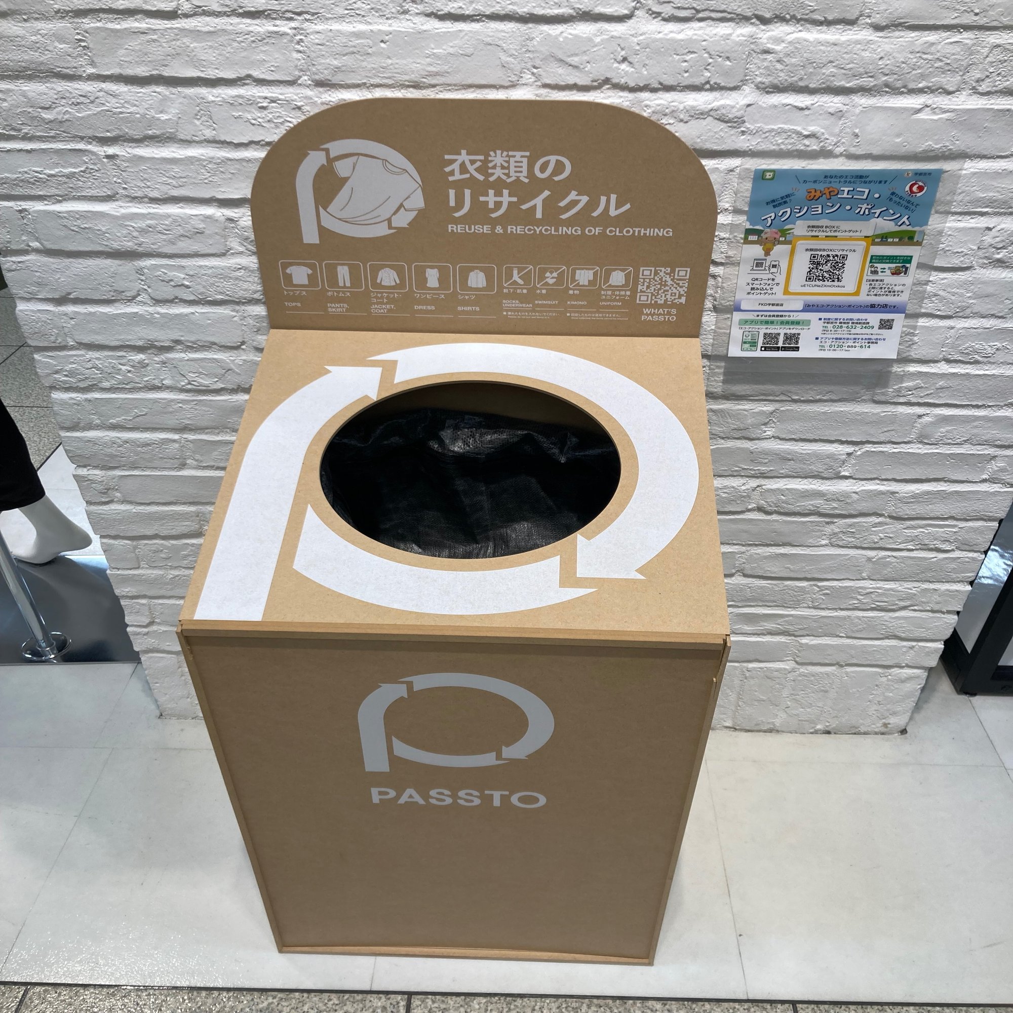 福田屋百貨店各店の衣料品直営売場(計9箇所)に、衣類回収BOXを設置しております。