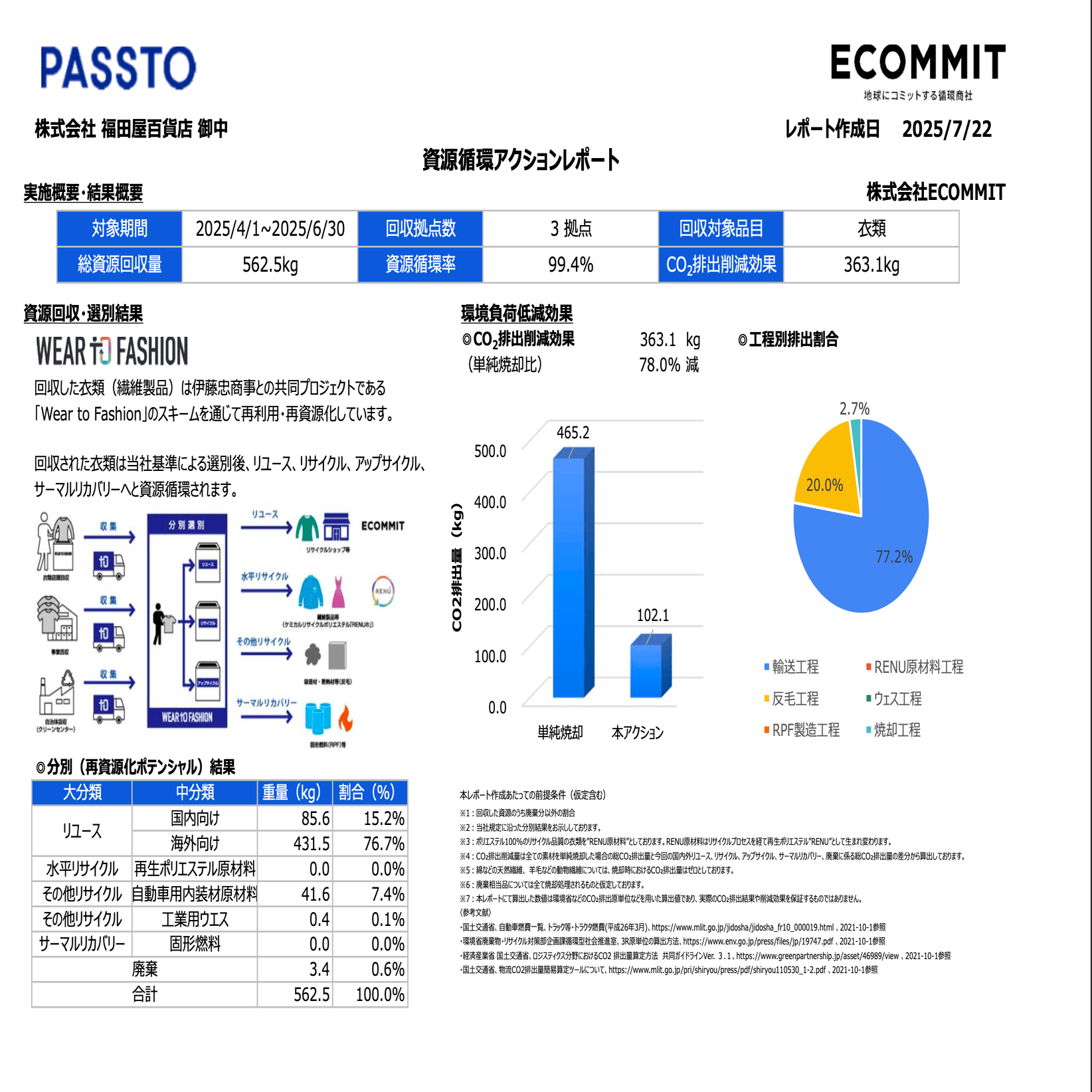 今回、回収した衣類が、リユースおよびリサイクルされず、焼却処分された場合、465.2kgのCO2を排出するとのこと。(レポートより)