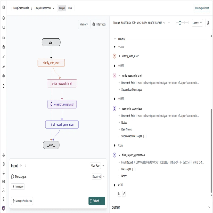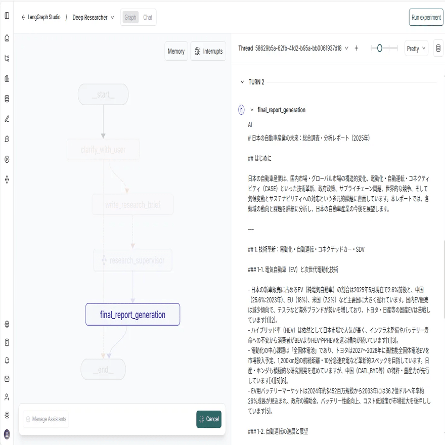 通常のLLM実行しただけでは得られないような深い調査をもとにしたレポートが生成されました。