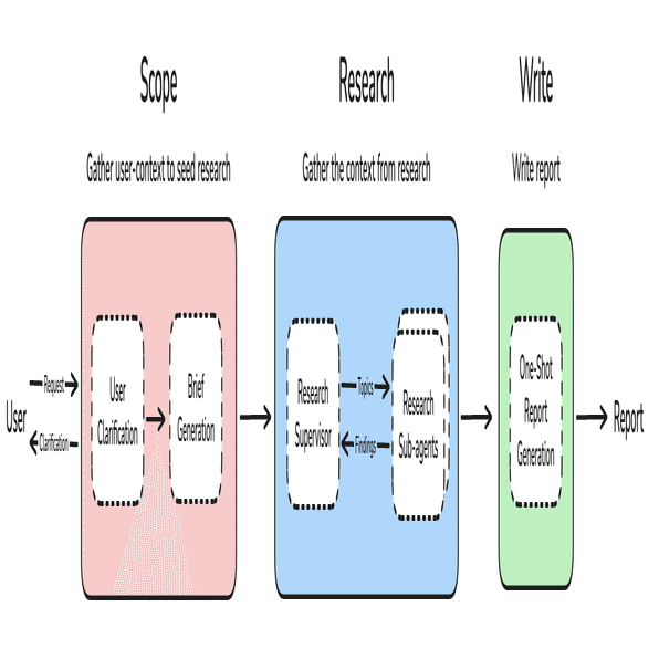自動化された調査ワークフロー:ユーザーがトピックを入力すると、トピックを細分化して検索し、収集した情報を要約してレポートとして提示します。