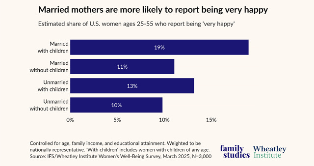 If you still don’t believe me, nearly twice as many married mothers say they are “very happy” as unmarried women without children.