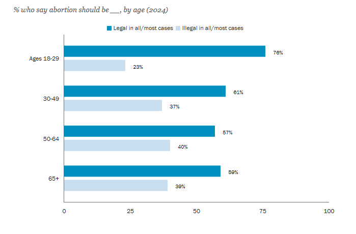 Furthermore, most people of all ages believe abortion should be legal in most, if not all, cases, which is a belief contrary to a traditional view on women and sexual ethics. Additionally, only 19% of adults think women should return to their traditional place in society, and only 29% of adults think that women not having children is a bad thing.