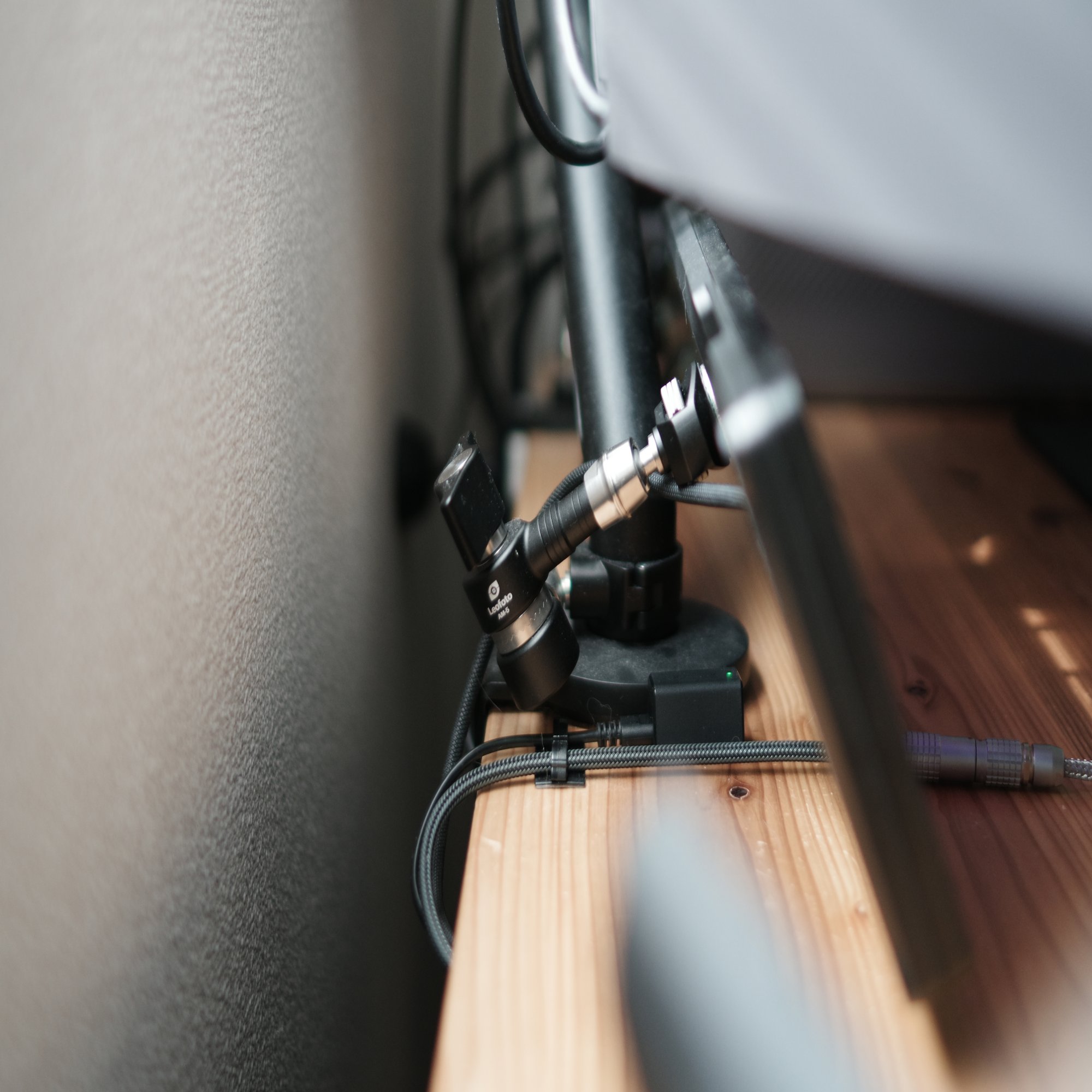 「なぜLeofotoなのか?」 理由はシンプルで、デスク上のスピーカースタンドにもLeofotoのクランプとマジックアームを使用しているからです。統一感出せるところは出すのが大事。
