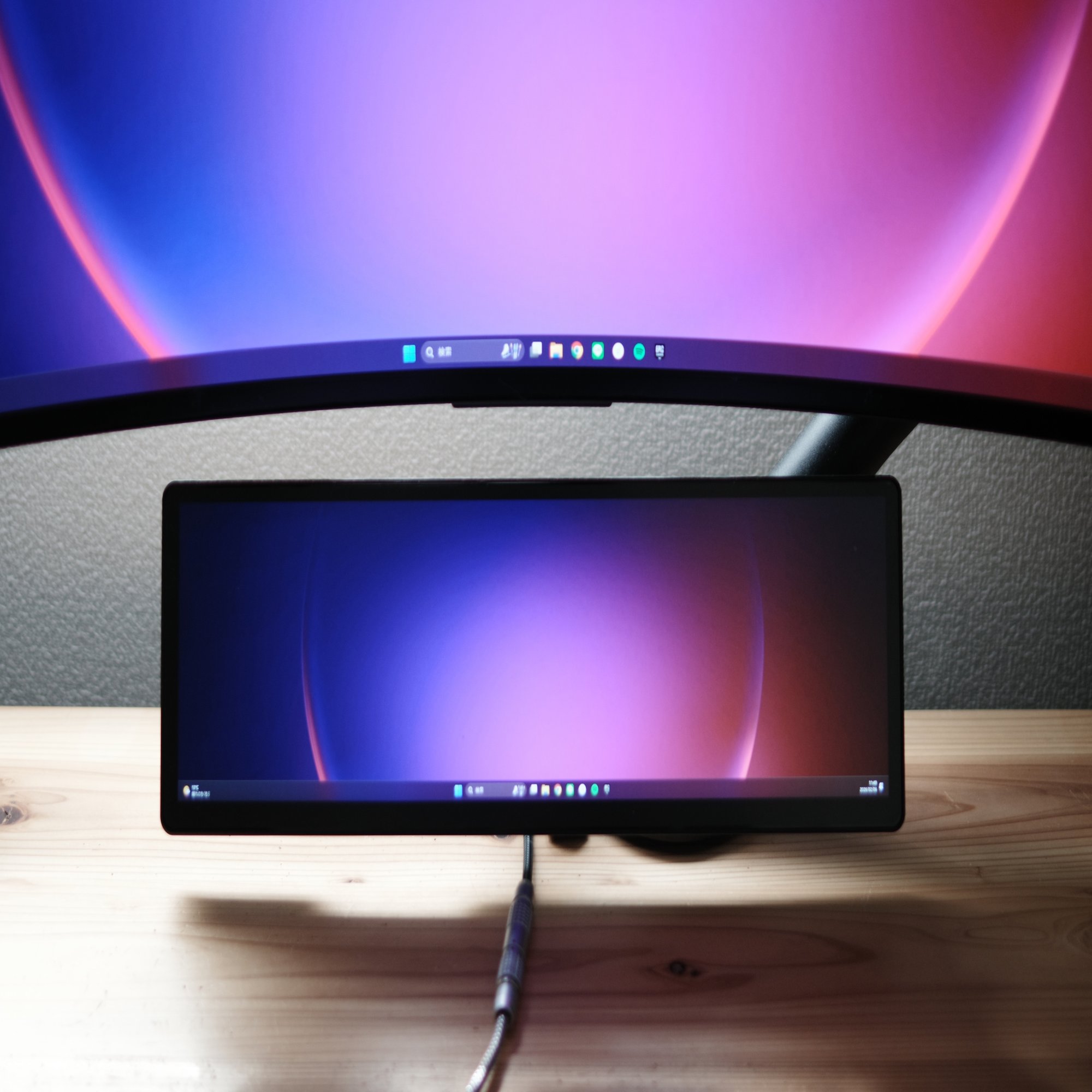 これは2,560×720解像度を持つワイドタイプのタッチスクリーン。 システム監視、Discordの常時表示、そしてショートカットキーを並べてバーチャルStream Deckとして使うなど、メインモニターの作業領域を侵食せずに「情報」だけを表示できるデスクの司令塔です。