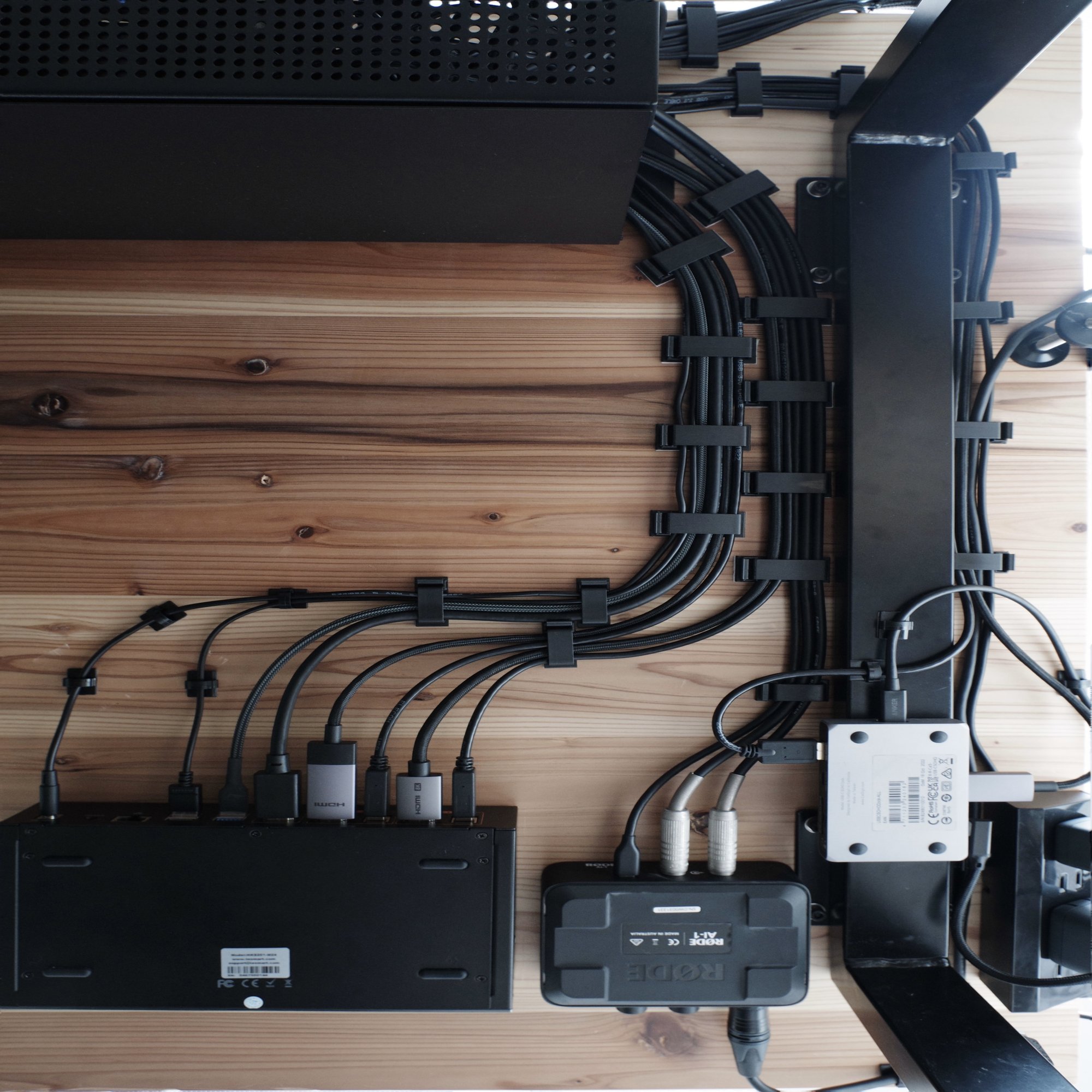 使用したのは、両面テープ式のケーブルクリップ。 これを天板裏に等間隔に貼り付け、複数のケーブルを「横並び」に這わせていきます。