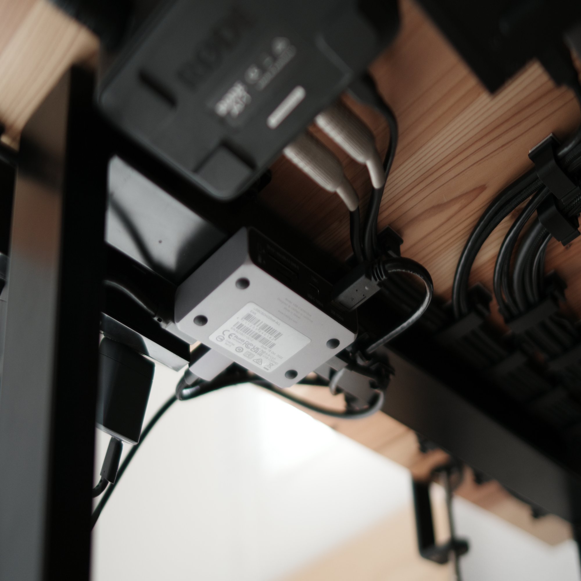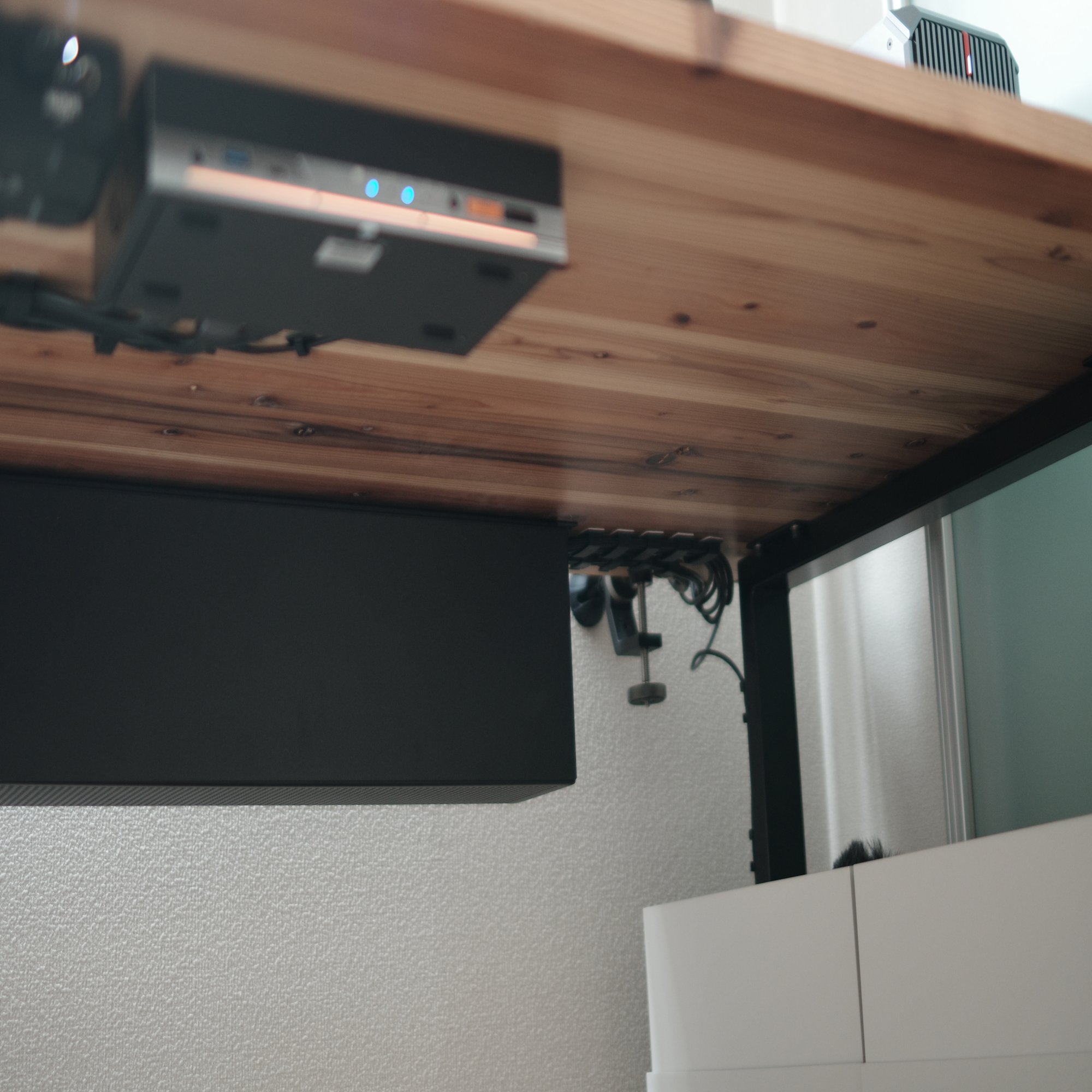 そこで導き出した最適解は、「デスク天板裏の、一番手前」への設置でした。(これをするためにKVMスイッチ付属の高品質なケーブルを使うのは諦めました。)