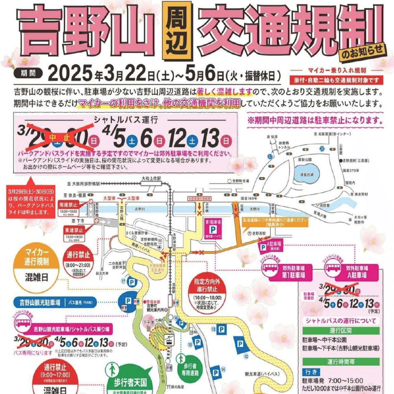 こちらは2025年の交通規制ですが、お花見の期間中は吉野山周辺で大規模な交通規制がかかるため、車で行くと追い返さる箇所もあります。かつ、周辺の道路も渋滞しがちなので正直おすすめしません!