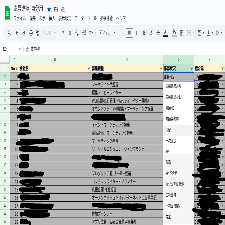 「_自分用」とあるのは一応エージェント用にも応募経路(紹介元)を抜いたものを作ってたんだけど、更新めんどくさくなってやめた名残。1つの求人に対して、複数のエージェントから同じ求人に応募することはできないので、それの重複防止のために作ってリンクで共有してた。