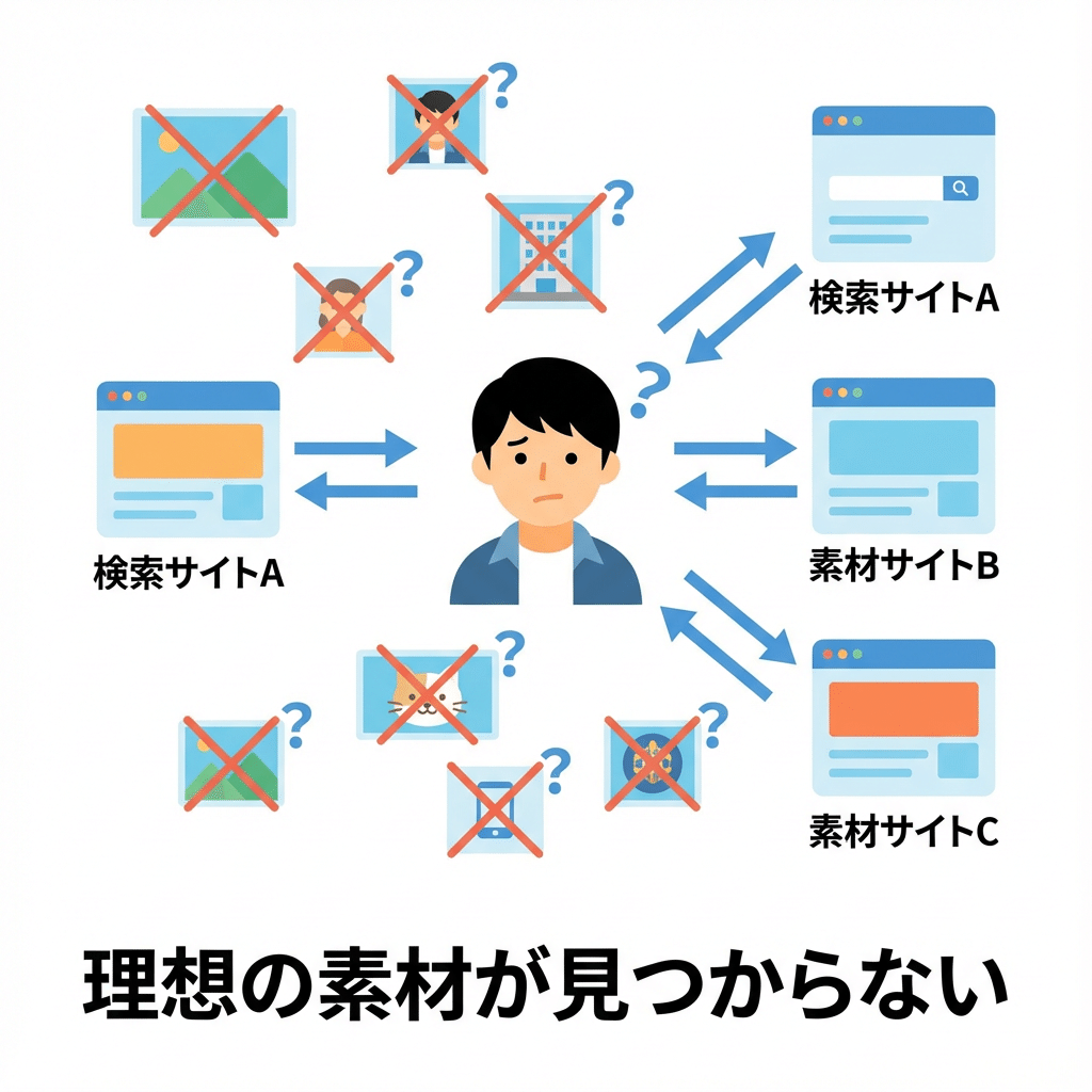 素材探し:フリー素材サイトを何個も回る → イメージに合うのがない → 妥協して使う...