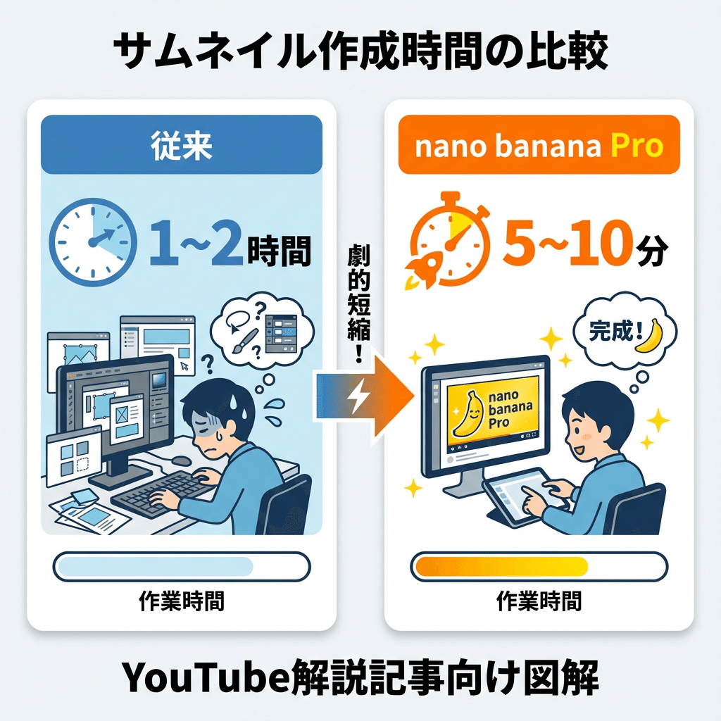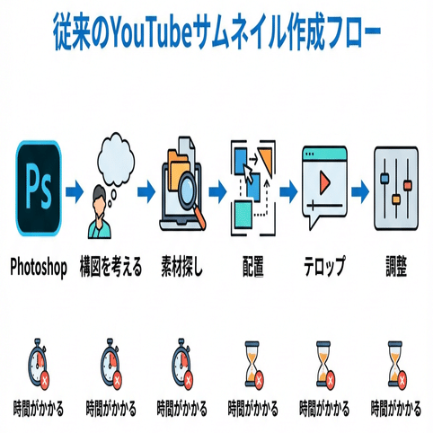 サムネ作成:Photoshop開く → 構図考える → 素材探す → 配置する → テロップ入れる → 調整...(1〜2時間)