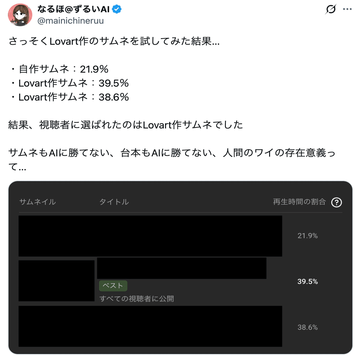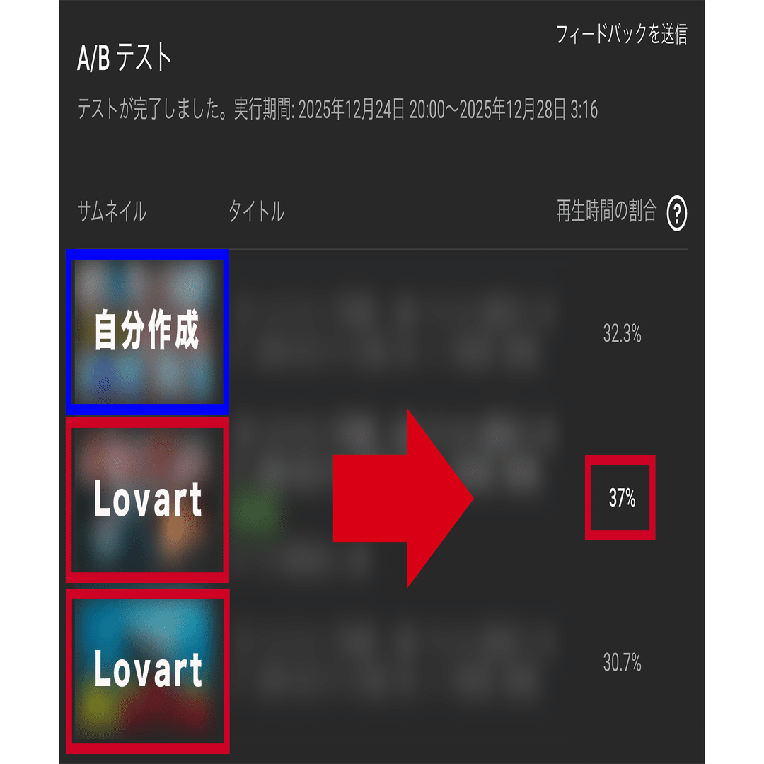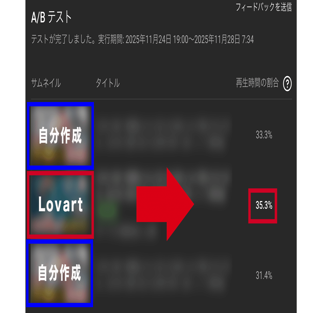今まで僕が作っていたサムネイルと、nano banana Pro(Lovart)を使ってポン出しで作ったサムネイルをABテストでの結果を比較したところ
