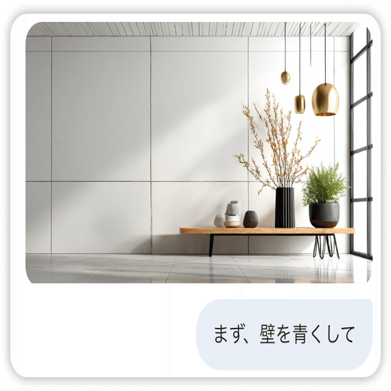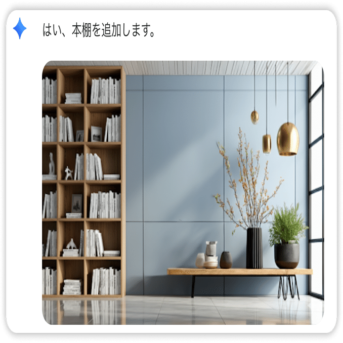 例えば、壁の画像を入力して、「まず、壁を青くして」とお願いし、その結果を確認してから「次に、本棚を追加して」と続けることができます。Gemini は前の会話の内容を記憶しているため、何度も同じ説明を繰り返す必要はありません。このスムーズなやり取りによって、皆さまの創造性をより引き出すお手伝いをします。