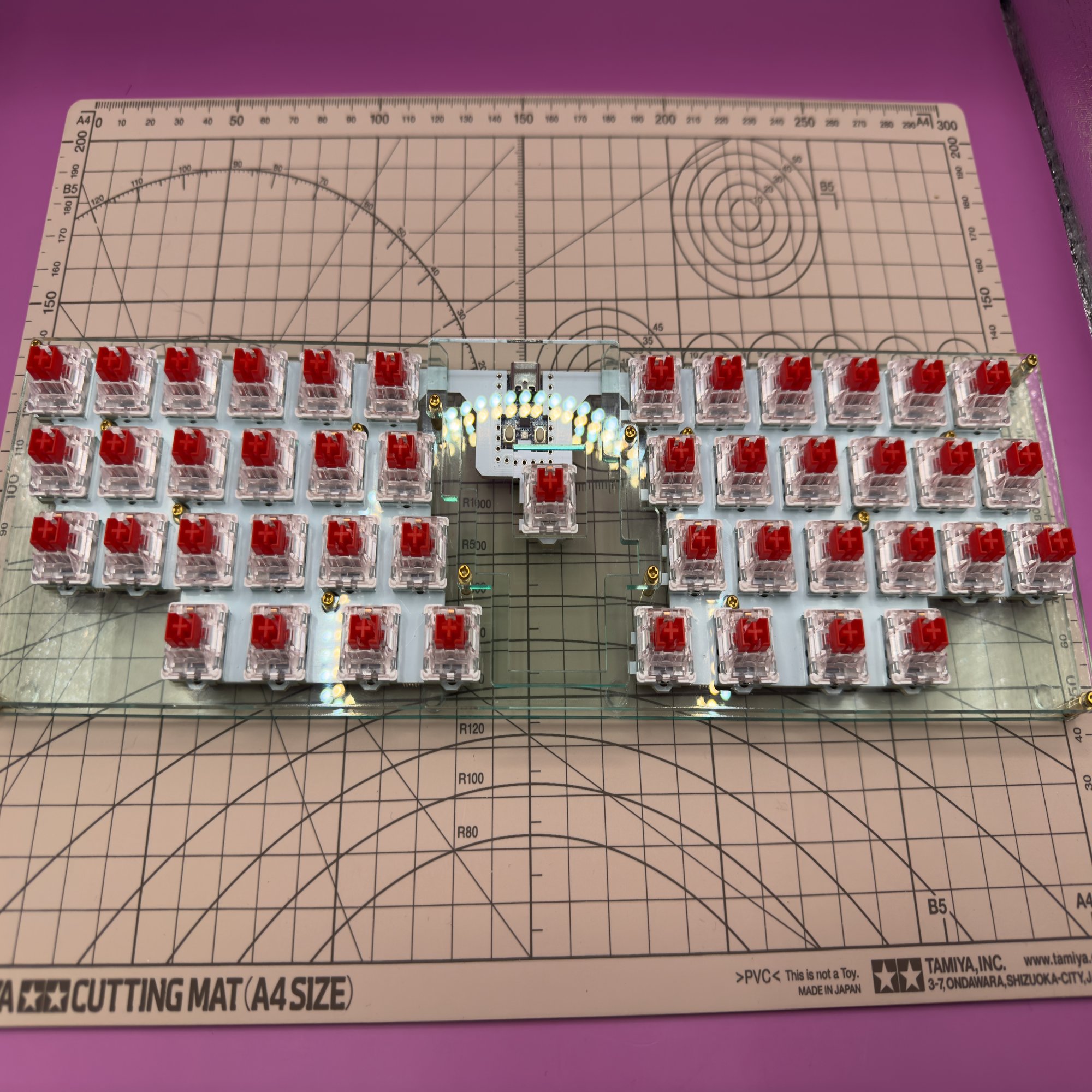 1度キースイッチを全部外し、アクリル板を外す必要はあるものの、同じ基板でキースイッチのプロファイルを変えられます。