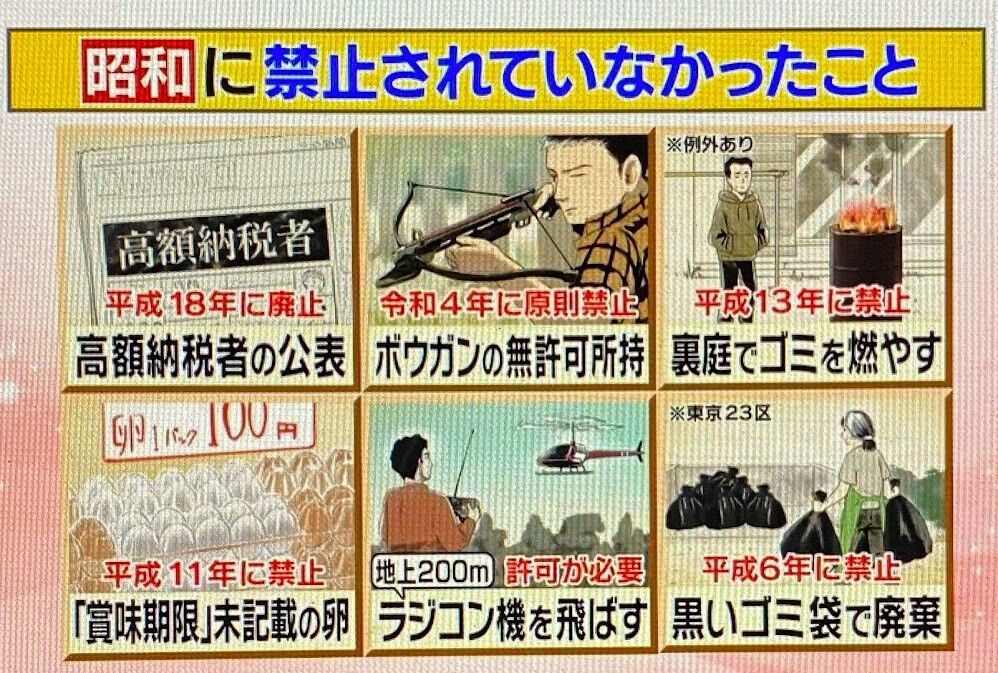 2023年03月31日 【解答】Qさま!(1/30)その3・ドボン問題第227弾 正解:7,飛行機に刃物の持ち込みハイジャック防止で昭和52年に法律で禁止・高額納税者の公表→国税庁が高額納税者を公表 個人情報保護法を機に平成18年に廃止・ボウガンの無許可所持→事件が多発し令和4年に原則禁止・裏庭でゴミを燃やす→悪臭防止などで平成13年に禁止※農業に伴う廃棄物の焼却などは例外として認められている・「賞味期限」未記載の卵→食中毒の危険性に伴い平成11年に禁止・地上200mにラジコン機を飛ばすドローンの墜落事故が増加したため、平成27年から事前に許可が必要に※150m以上の場合・黒いゴミ袋で廃棄 ※東京23区→中身が見えず清掃員の怪我が多発。平成6年に禁止