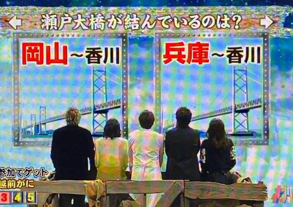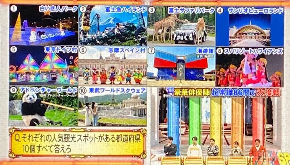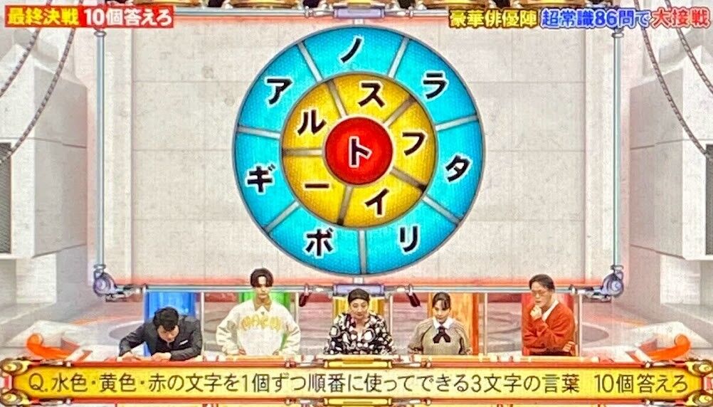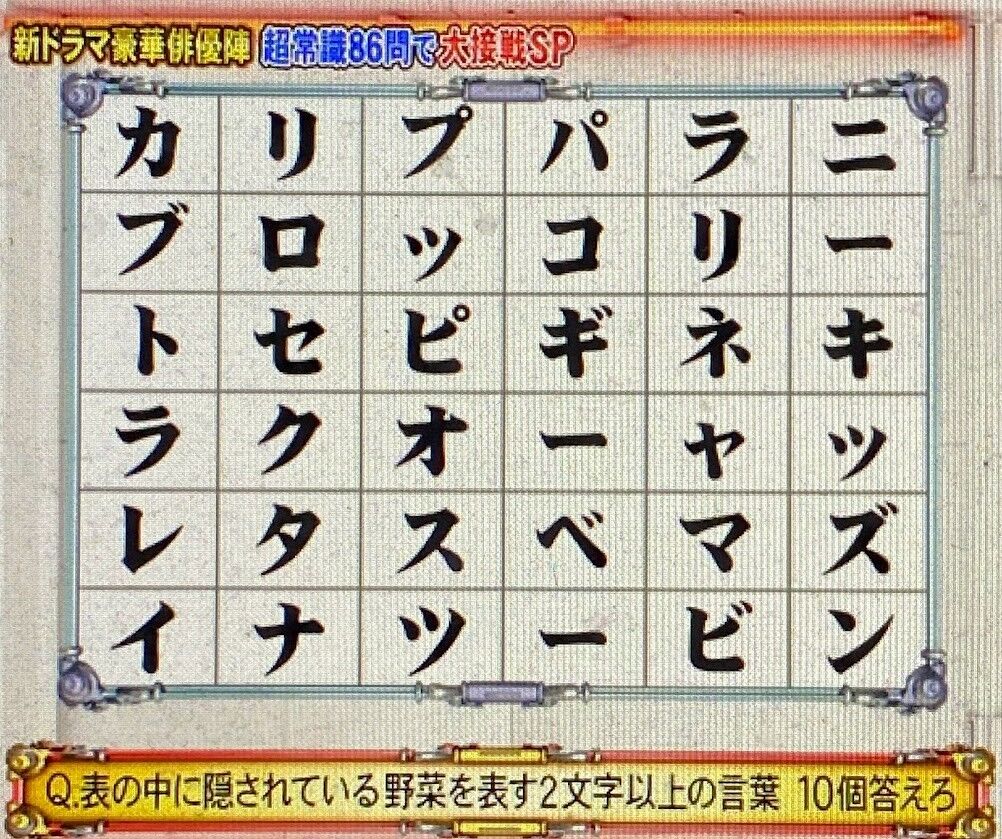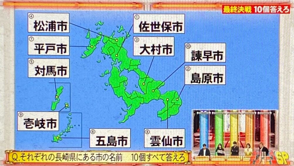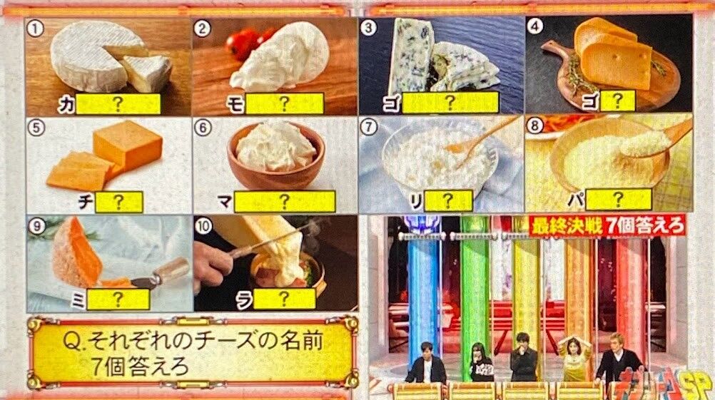 2024年03月25日 【問題】ネプリーグ(1/8)その7 ハイパーボンバー1,水色・黄色・赤の文字を1個ずつ順番に使ってできる3文字の言葉 10個答えろ※同じ色の文字を使う・色の順番を変える→NG2,それぞれの人気観光スポットがある都道府県 10個すべて答えろ3,漢字辞典に載っている画数が2画の漢字 10個答えろ4,それぞれの長崎県にある市の名前の読み 10個すべて答えろ5,表の中に隠されている野菜を表す2文字以上の言葉 10個答えろ※縦・横・斜め どの方向から読んでもOK 同じ文字を何度も使用可 曲がって読むのはNG6,それぞれのチーズの名前 10個すべて答えろトロッコ2択7,かどまつは?角松 門松8,市外局番「054」は?名古屋市 静岡市9,正しいのは?※右か左かでお答えください10,瀬戸大橋が結んでいるのは?岡山~香川 兵庫~香川11,フランス発祥は?マカロン カヌレ答えは26日以降を予定してます