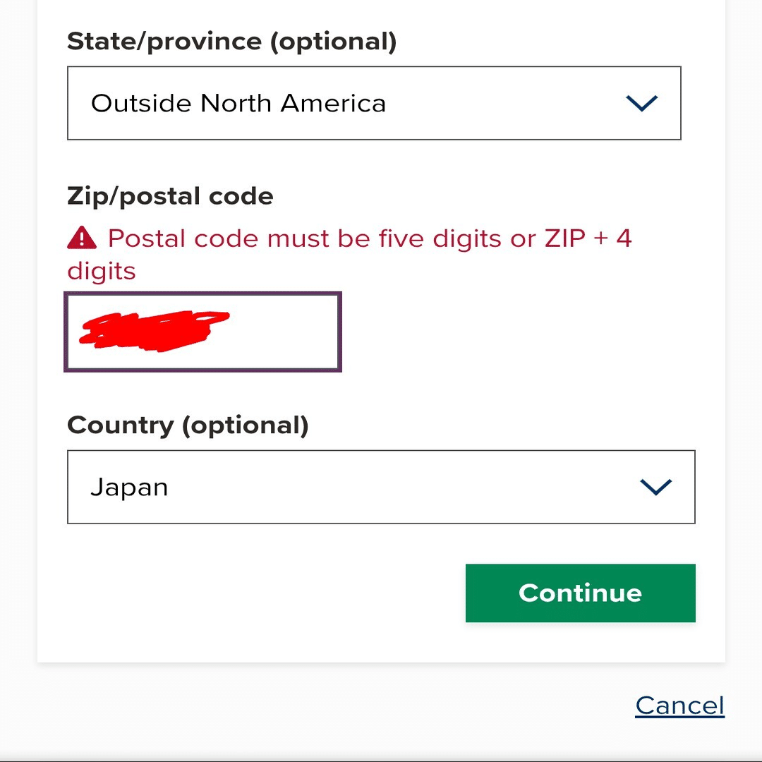 国を「Japan」に設定しても、郵便番号(Zip Code)の欄がアメリカ形式の5桁入力を求められ、日本の郵便番号が通りません。