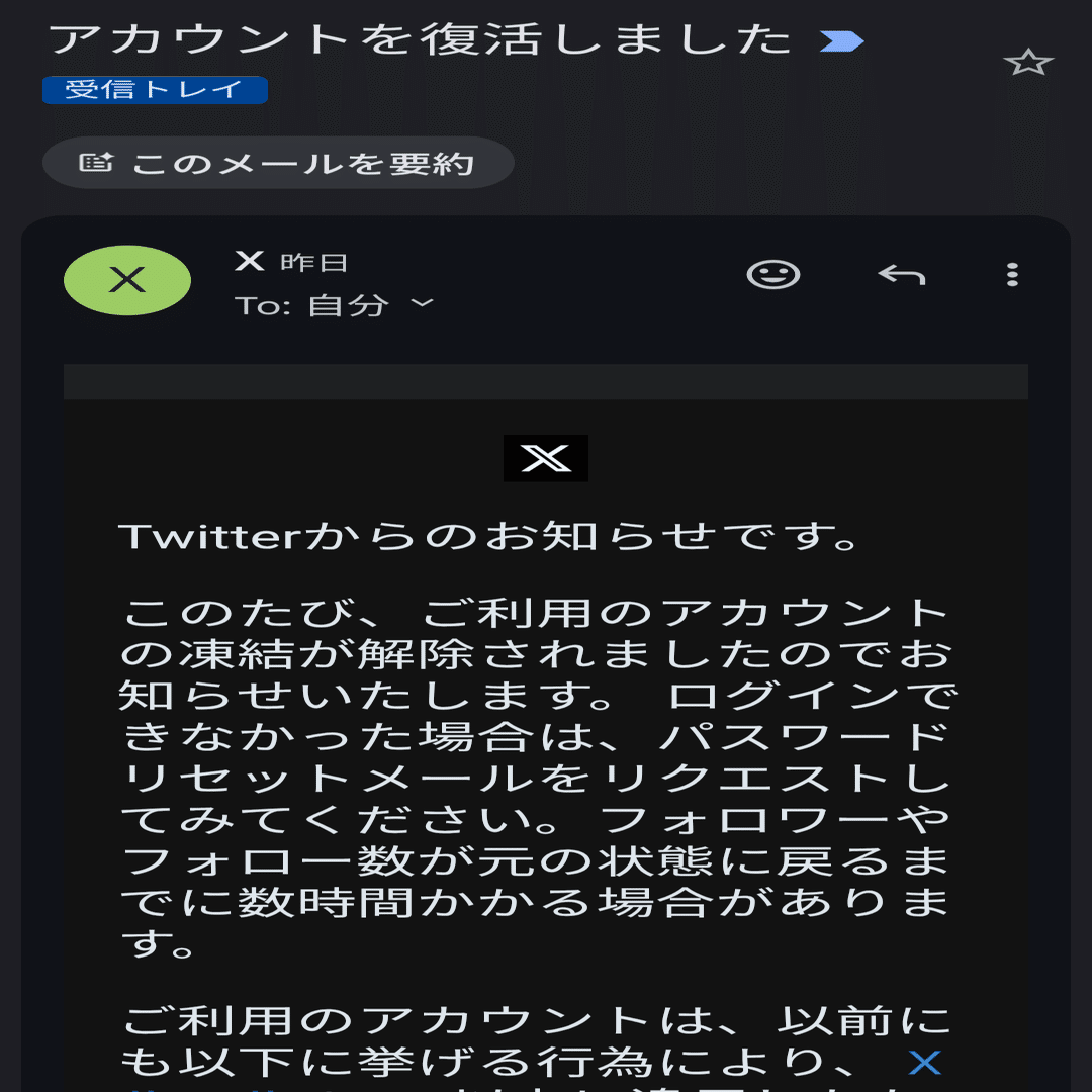 ただ、届いたメールの文面には「過去に以下に挙げる行為により、Xルールの1つ以上に違反したために凍結されたことがあります」と書かれているだけで、具体的に私のどの行動がNGだったのかは明言されず、真相は闇の中です。