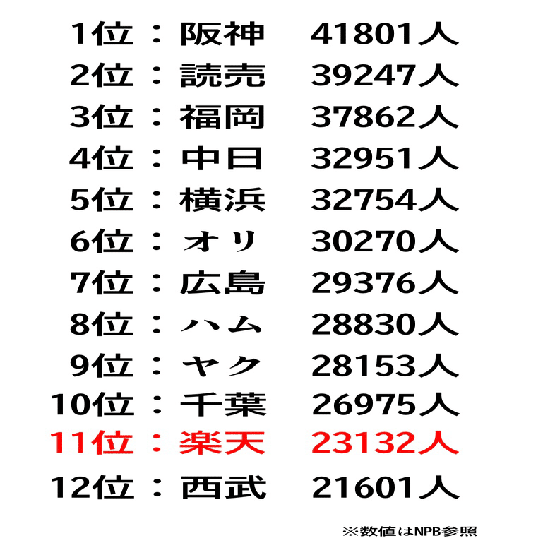 以下、1試合あたりで平均した12球団の観客動員数ランキングである。