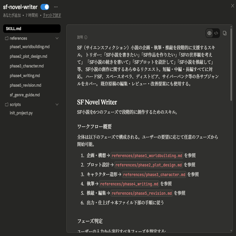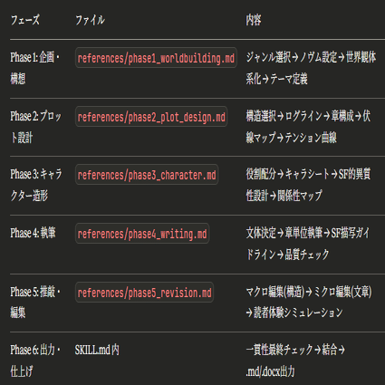 小説の作成を上記1のフェーズごとに実行するためのSkillsを作成してもらいました。