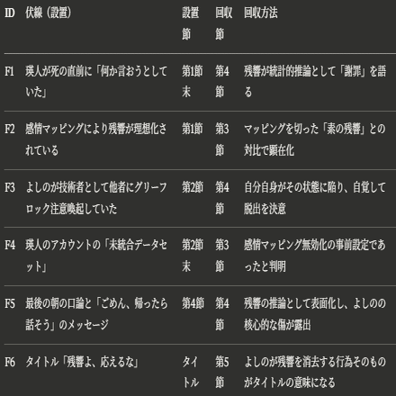 瑛人はそれを知っていたのだろうか。技術的な仕組みは理解していなかったとしても、直感的に——自分の残響が「優しすぎる偽物」になることを、どこかで感じ取っていたのだろうか。だからマッピングを切った。鎮痛剤を抜いた。