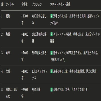 Claudeにまず全体のあらすじを作らせ、次に章ごとのプロットポイントを展開させると、一貫性のある長編構造が作りやすくなります。