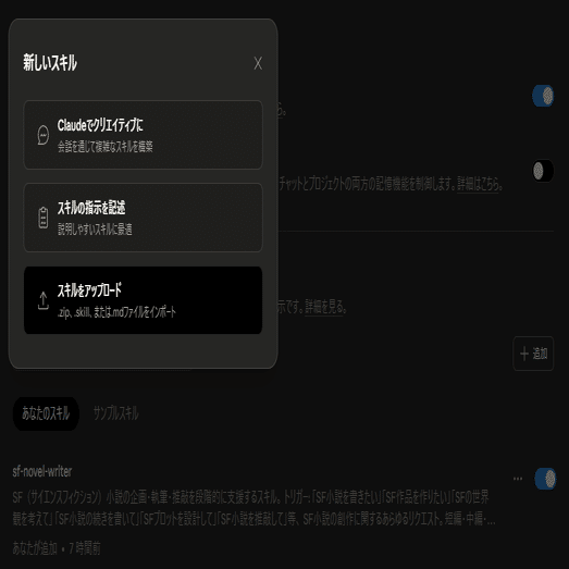 👆このスキルファイルをClaudeの「設定」→「機能」→「スキル」から「+追加」をクリックして、アップロードしてください。