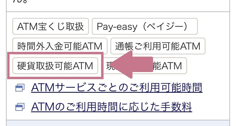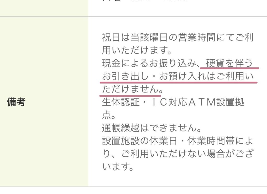 まず、利用のATMが硬貨の入出金ができるかを知りたい場合は、店舗詳細ページ下部にある備考欄に「硬貨を伴うお引き出し・お預け入れはご利用いただけません」という表記がないかをチェックします。備考欄にこの記載がない場合は無人ATMでも硬貨の入出金が可能です。