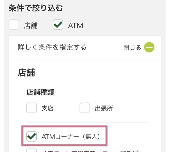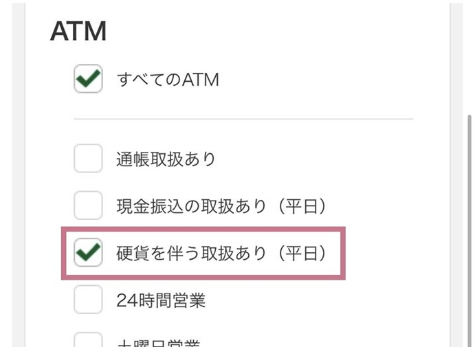 三井住友銀行店舗ページの備考欄 また、硬貨が入出金できる無人ATMを絞り込んで見つけたい場合は、店舗のしぼりこみ検索機能を使い、「ATMコーナー(無人)」と「硬貨を伴う取扱あり(平日)」にチェックを入れると、該当するATMの一覧を表示することができます。↓