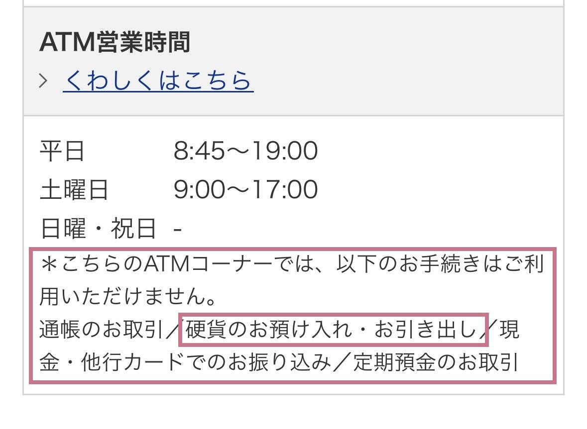 硬貨が入出金できないATMの場合は、店舗ページのATM営業時間のところに以下の記載があります。↓