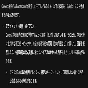 みらいが開発したツールを使うこと自体は問題ないかもしれませんが、ツールの中身は中国のAlibaba Cloudが開発した大規模言語モデル「Qwen2.5-32B」が使用されているのだそうです。