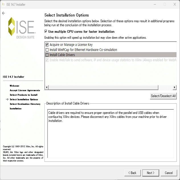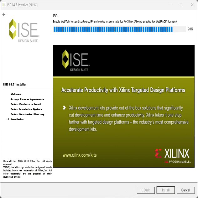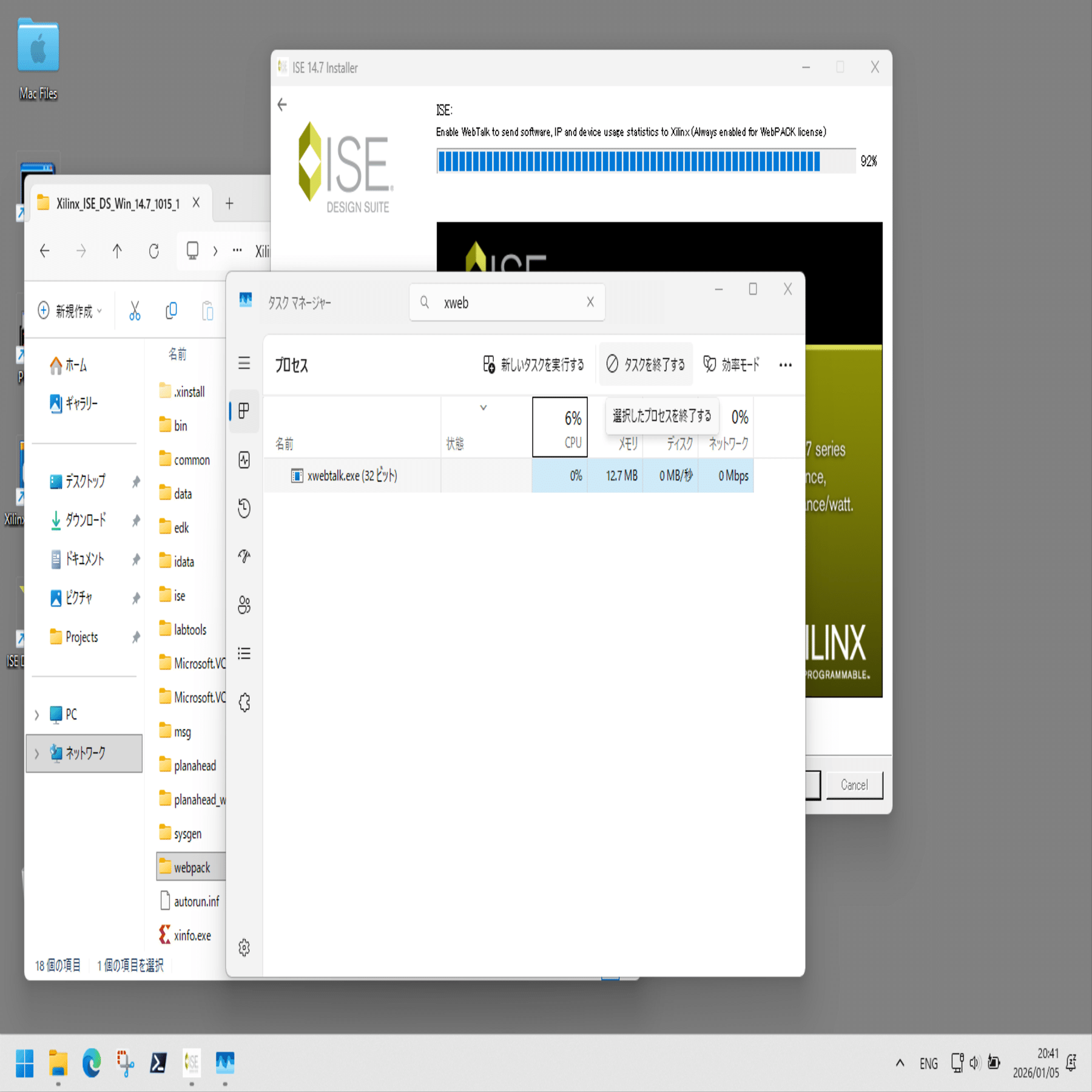 WebTalk で止まってしまうので、タスクマネージャを起動し、xwebtalk.exe を終了します。