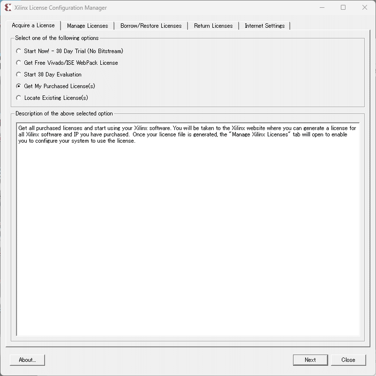 Manage Licenses タブ、Load License… で、ライセンスファイルを指定します。